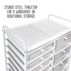 - Organize across 10 small and 5 large white drawers with white knobs