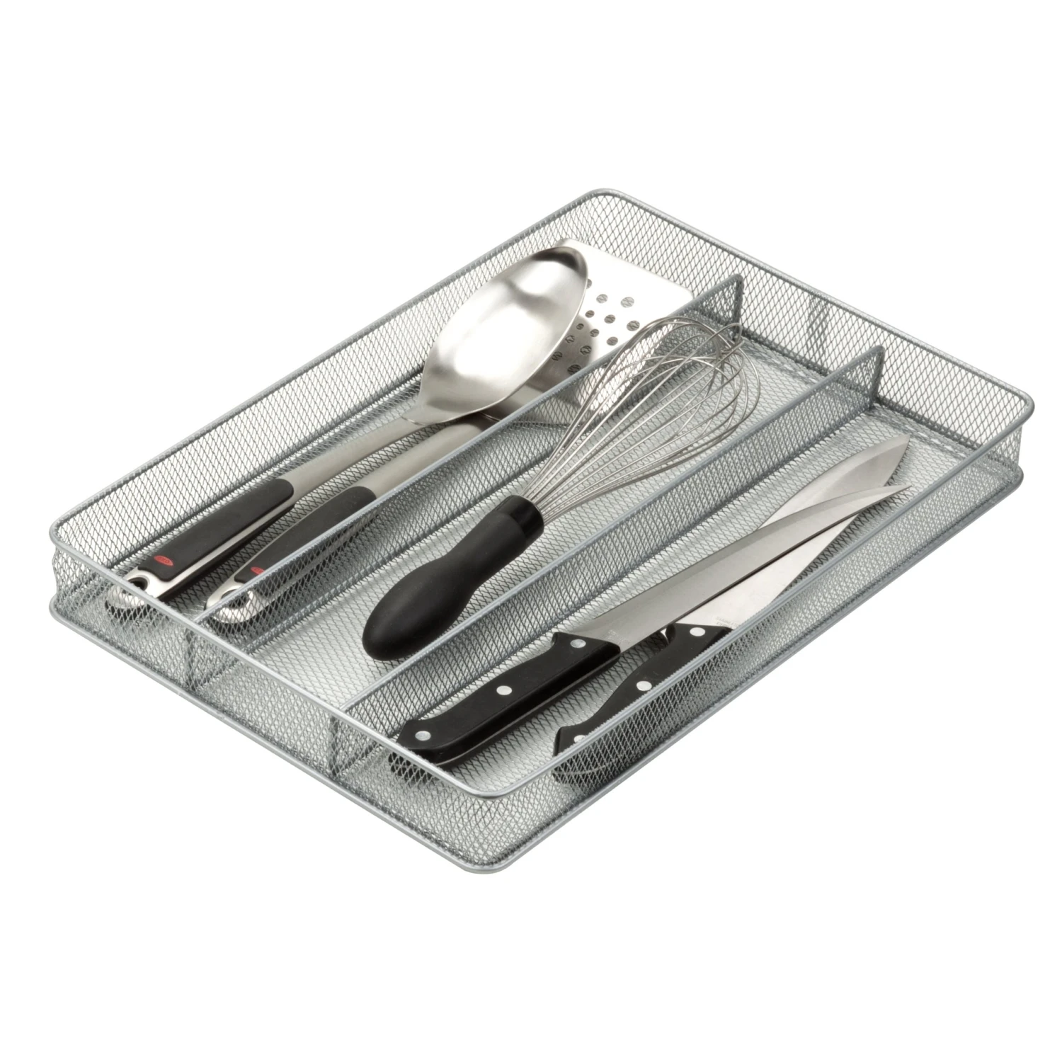 This 3-compartment drawer organizer fits all your standard flatware neatly in its own place. The mesh construction is easy to clean and its versatility is endless: Its 2-inch height makes it ideal for office storage, makeup storage, arts & crafts or even matchbox car storage.