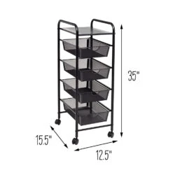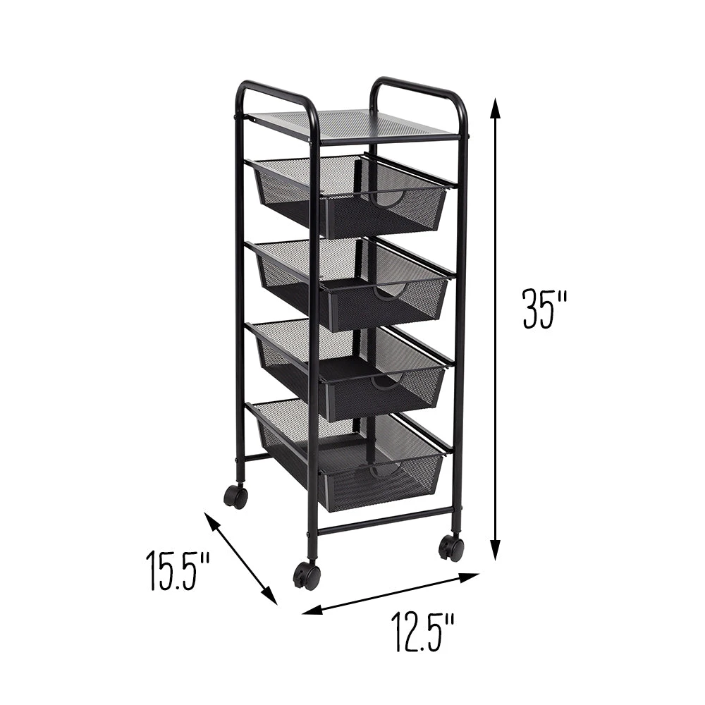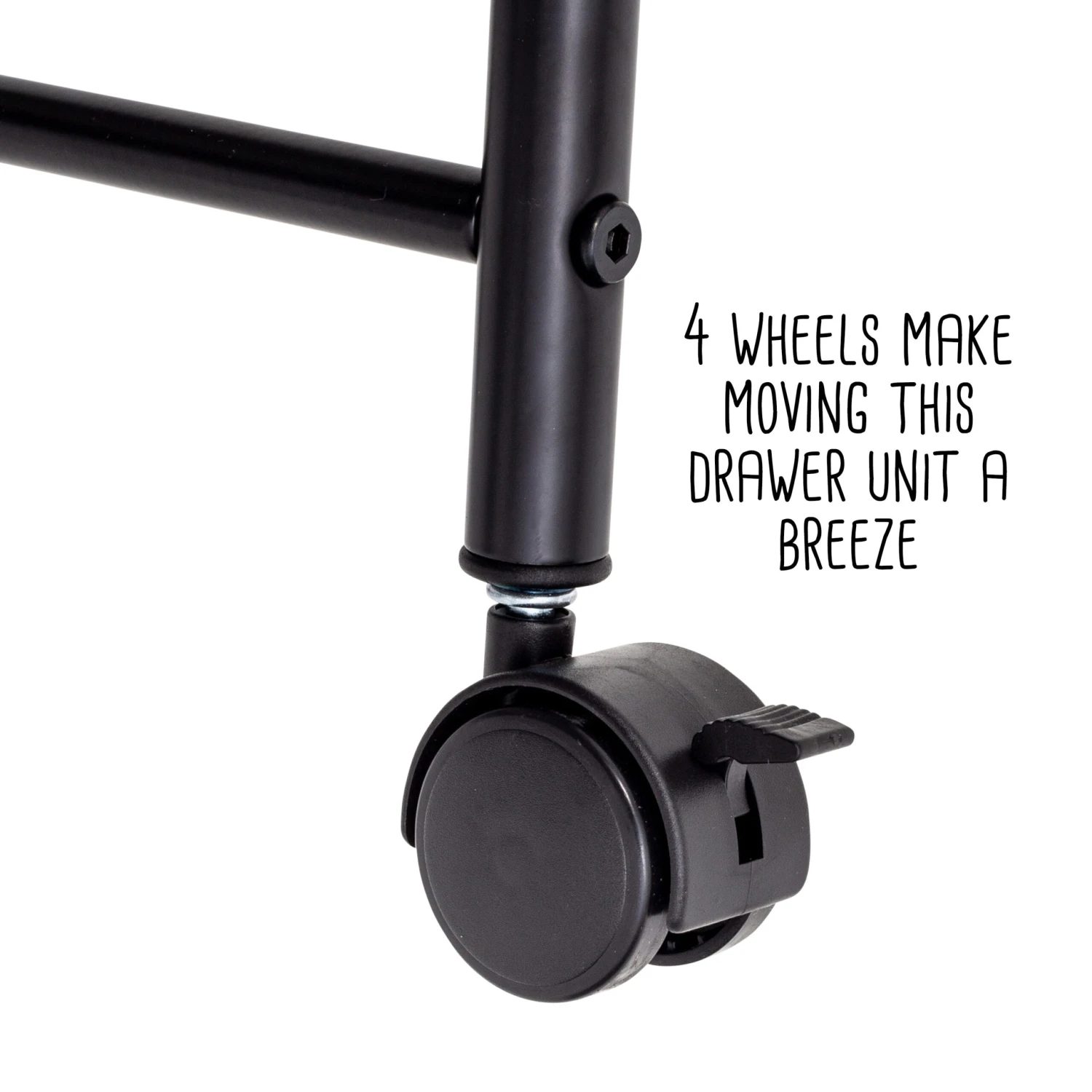 This black utility cart is ready to roll to the rescue and tackle your clutter. Its 4 metal drawers will effortlessly organize office supplies, toys, makeup, school supplies, tools, kitchenware, and more. Have items that need to be accessed frequently? The top tray has you covered, keeping everything from paintbrushes to hairspray in arm’s reach. On top of its storage superpowers (or should we say below), it also has a set of 4 wheels that make this an ideal portable storage solution. So whether you want to stash this black rolling cart away in a closet or wheel it into another room, all it takes is a little push.