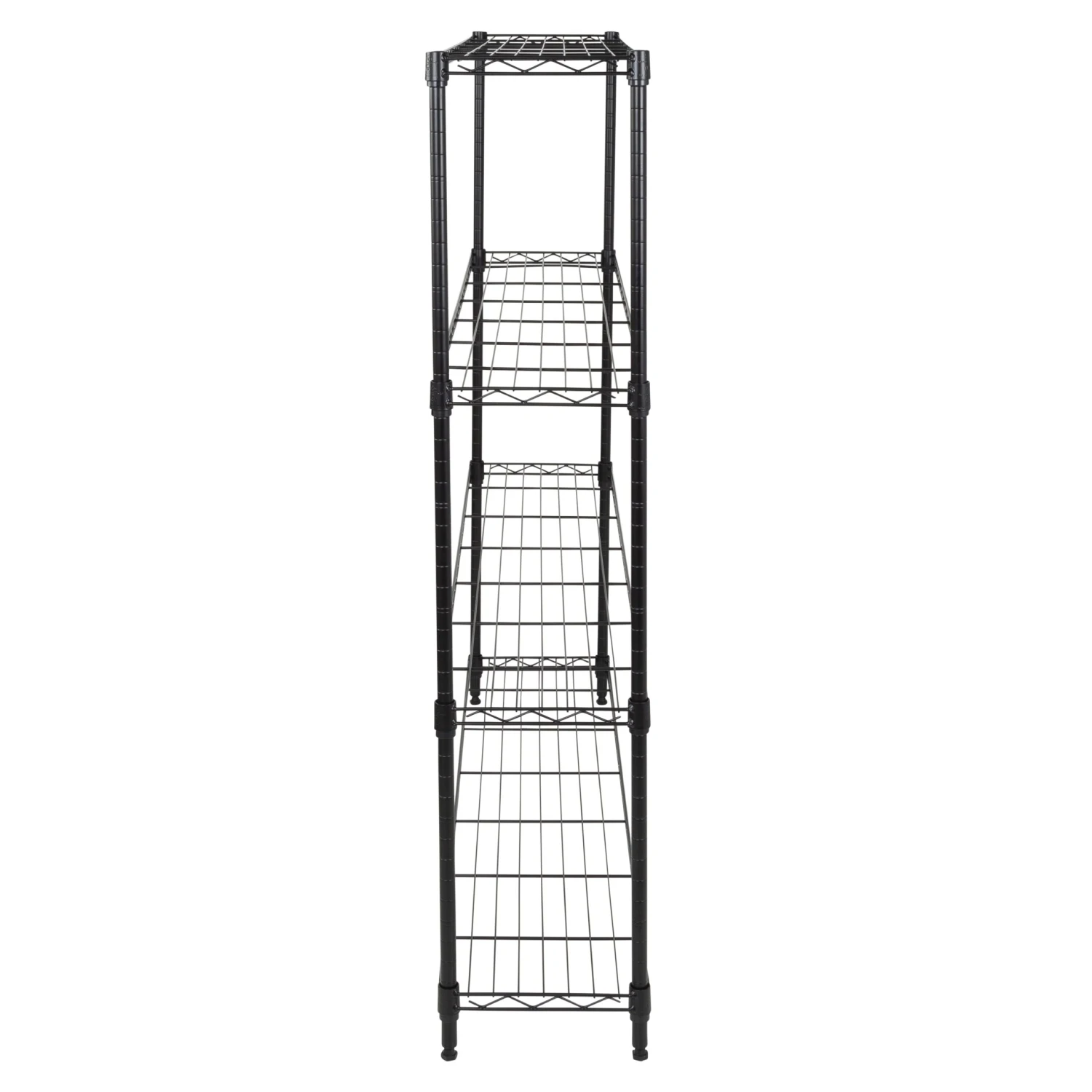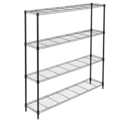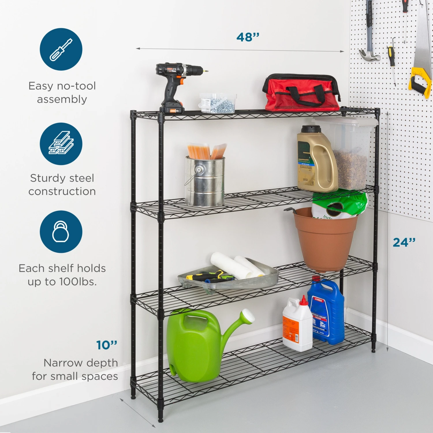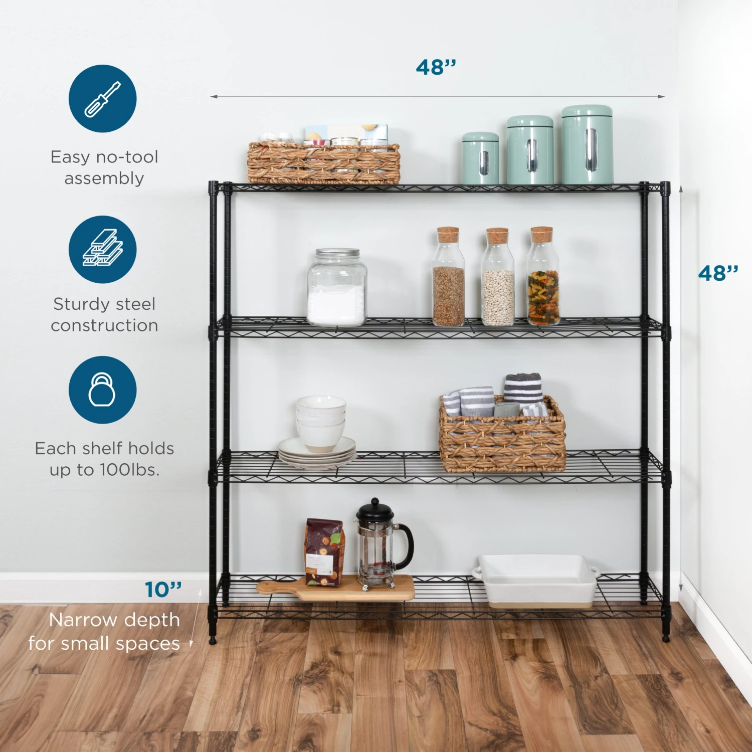 Optimize your storage space with the 4-Tier Slim Profile Wide Shelving Unit, perfect for narrow yet wide spaces in your home. Measuring 48 inches in length and only 10 inches in depth, this unit is ideal for fitting against longer walls, behind furniture, or under windows in garages, pantries and basements. With height-adjustable shelves and a sturdy construction that supports up to 100 lbs per shelf, this rust-resistant steel organizer offers both durability and flexibility. Easy to assemble with no tools required, it features leveling feet and plastic couplers, ensuring a sleek and organized storage solution for any small space.