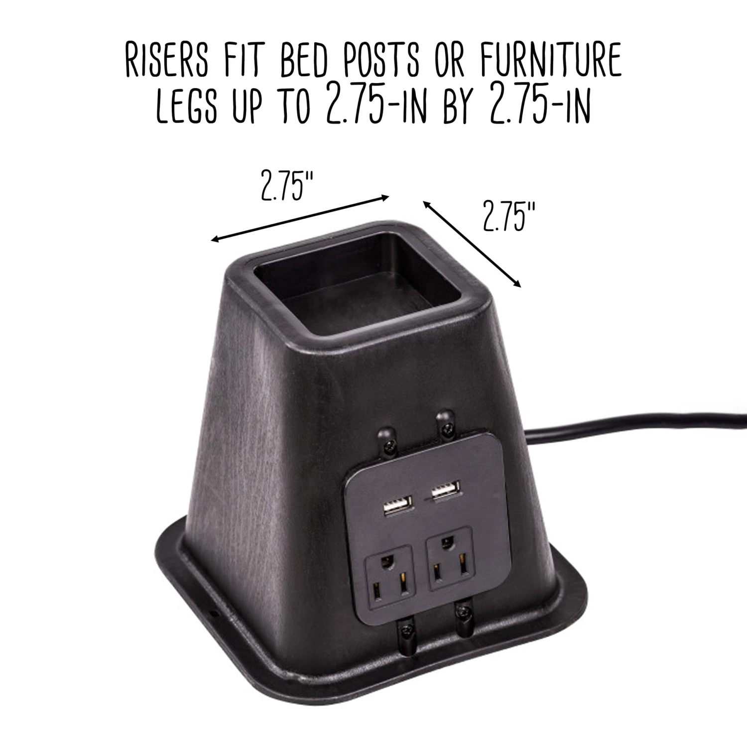 - Bed risers fit bed posts or legs up to 2.75 inches by 2.75 inches