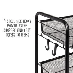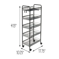 This rolling storage cart is a versatile metal organizer that is up to any task. Its 5 mesh shelves provide ample room for all of your storage needs, while the 4 wheels allow you to roll it around with ease. And there is no need to worry about your items taking a dive while this rolling shelf cart is on the move—the wheels provide a smooth ride, while the tray-shaped shelves keep all your items corralled. Need to keep items easily accessible? The 4 side hooks are a simple yet powerful addition that will hold everything from cooking utensils to hair accessories within reach.
