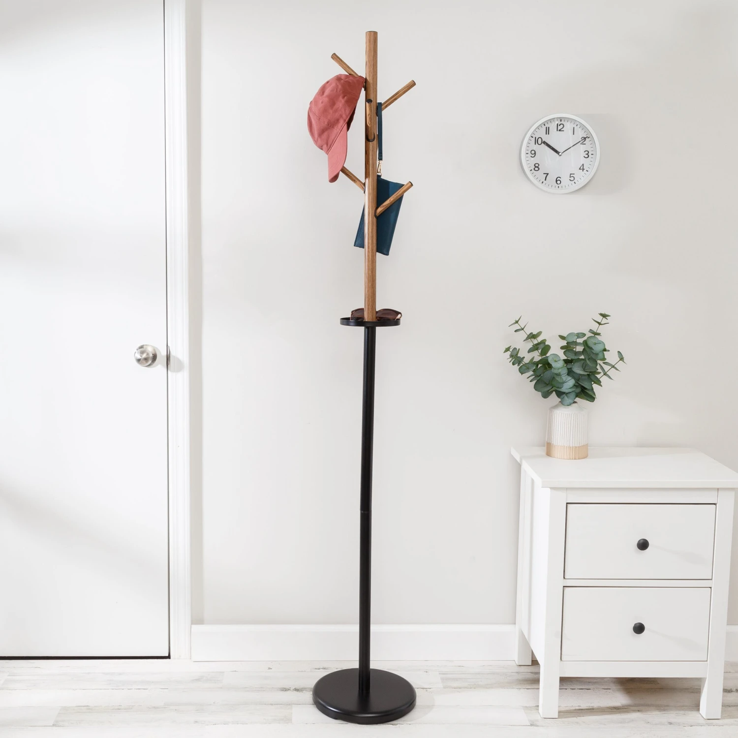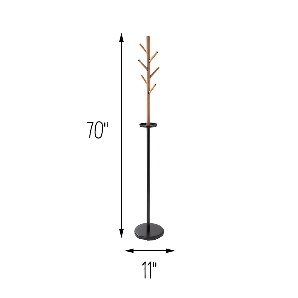 Make your entryway of mudroom extra memorable—and functional—with a freestanding coat rack designed to look like a tree. The textural tree branch top features 6 pegs, so guests will always have a place to hang their jacket. Always losing your keys? Keep them in one place with the round tray that divides the contrasting faux wood and bold black metal. Travel farther down the design and you will find the sturdy round base that keeps this rustic coat tree stand from toppling over. No water required, no shedding leaves, and pure function—this unique coat stand is an organizational tree-t that with leaf your entrance, mudroom, or office tidier and all the more stylish!