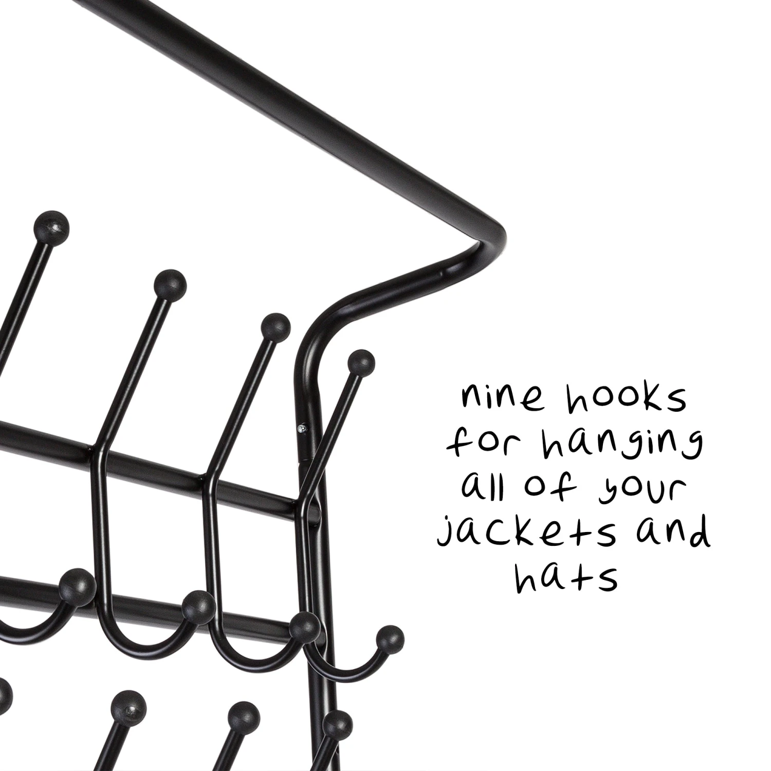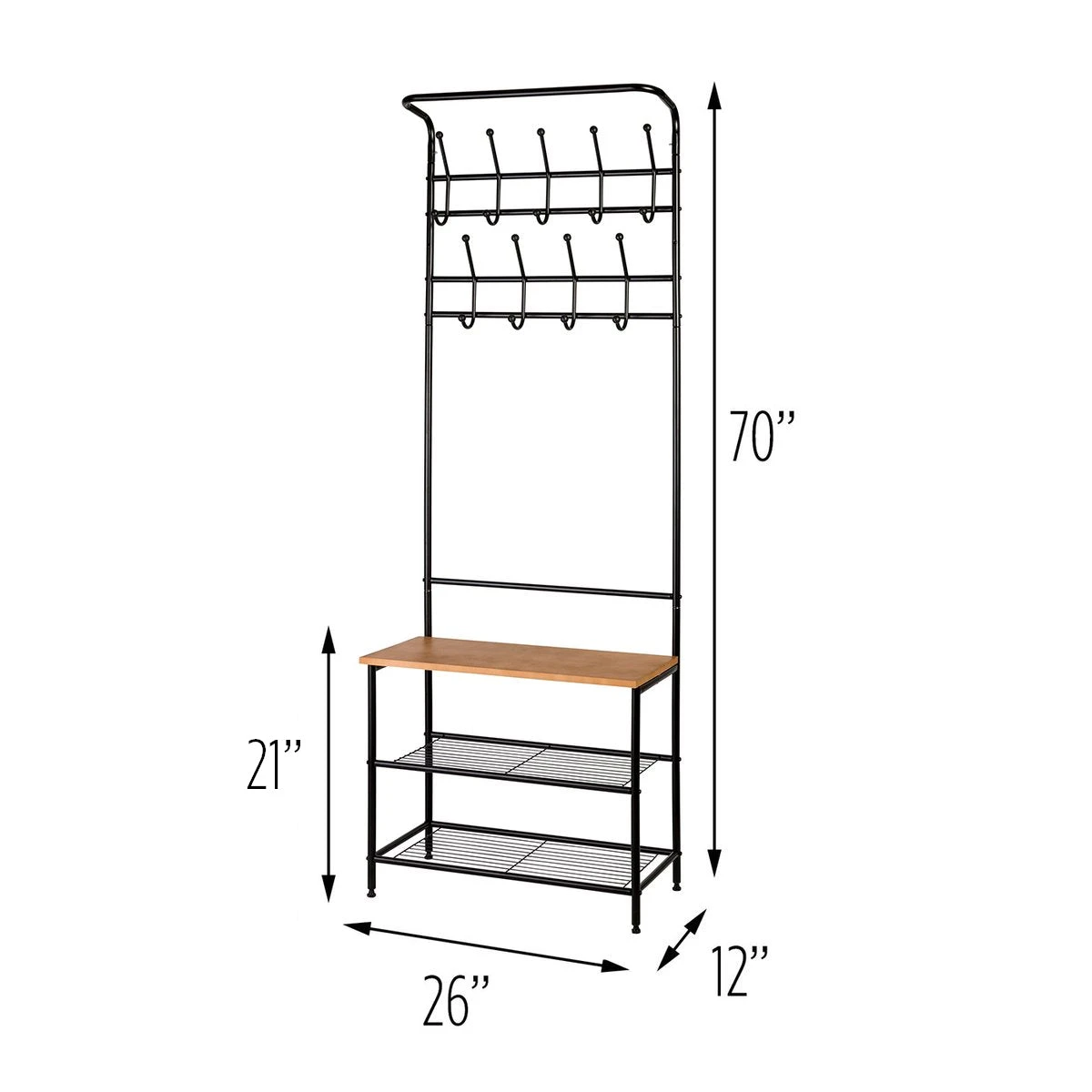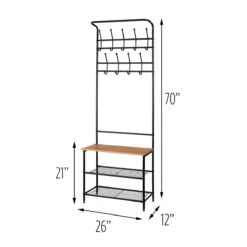 This handy entryway organizer includes two levels of coat hooks to hold hats, jackets, keys or coats. The steel wire bottom shelves hold several pairs of shoes, or accessorize with small baskets for gloves or a dog leash. The wood storage bench is great for setting bags, purses, backpacks and more as you walk in the door.