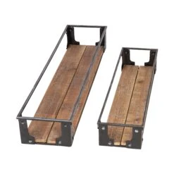 This set of shelves has an interesting design different from most floating shelves. The mixed metal and wood construction features a steel rail around the top edge of the shelf, making the shelves closer to floating open boxes. This rail functionality makes the shelves ideal for displaying taller objects that may precariously teeter on a traditional floating shelf. Think of it almost like an indoor flower box, a perfect home for a narrow vase bursting with wildflowers or a ceramic pot sprawling with spiky leaves of a planted palm. No matter what’s on display behind the sleek steel railing, it will be well kept in its place on the handsome fir shelving.