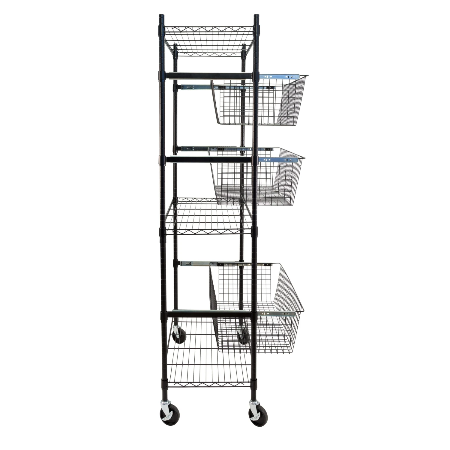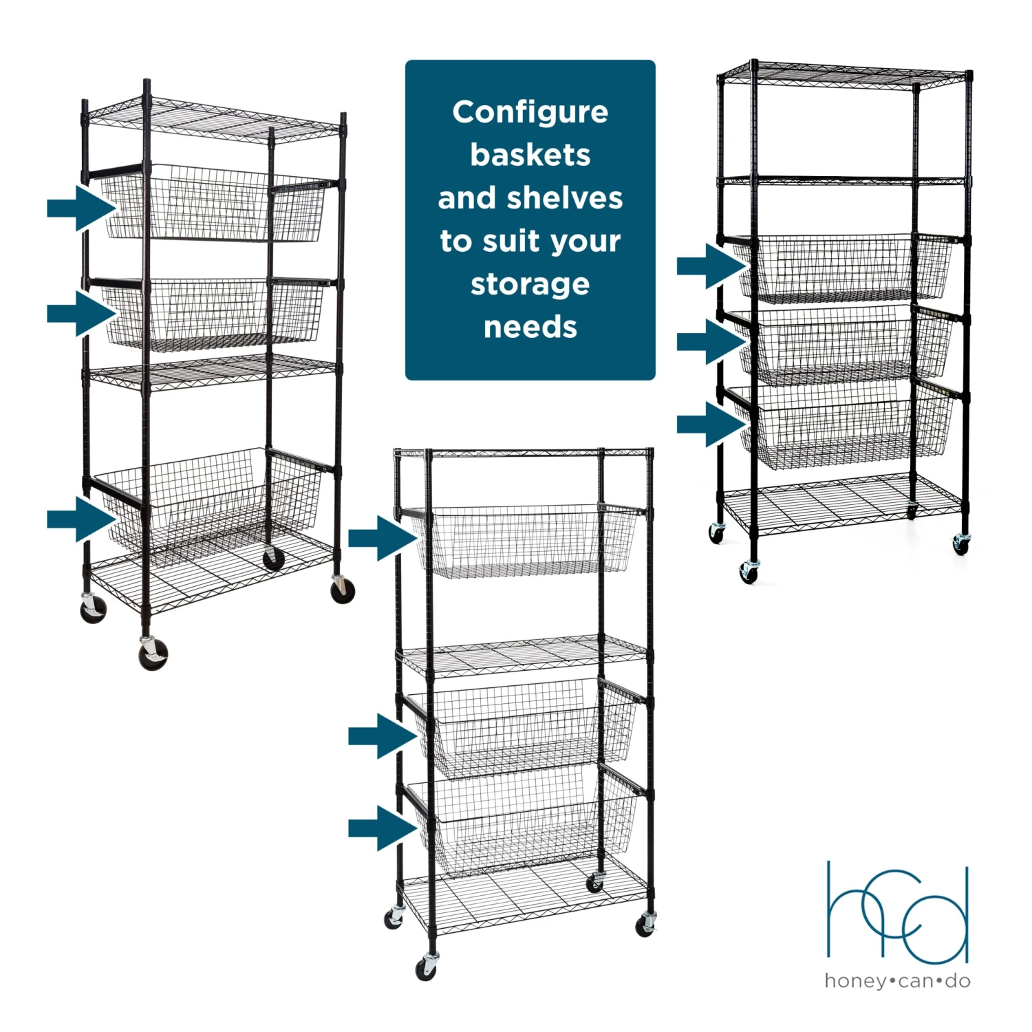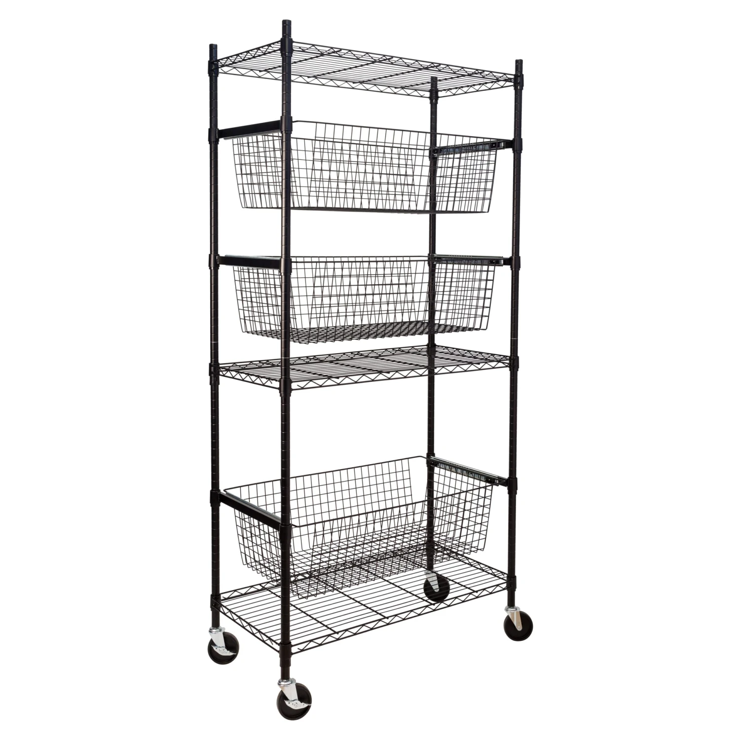 - Customize by placing baskets and shelves wherever it fits your needs
