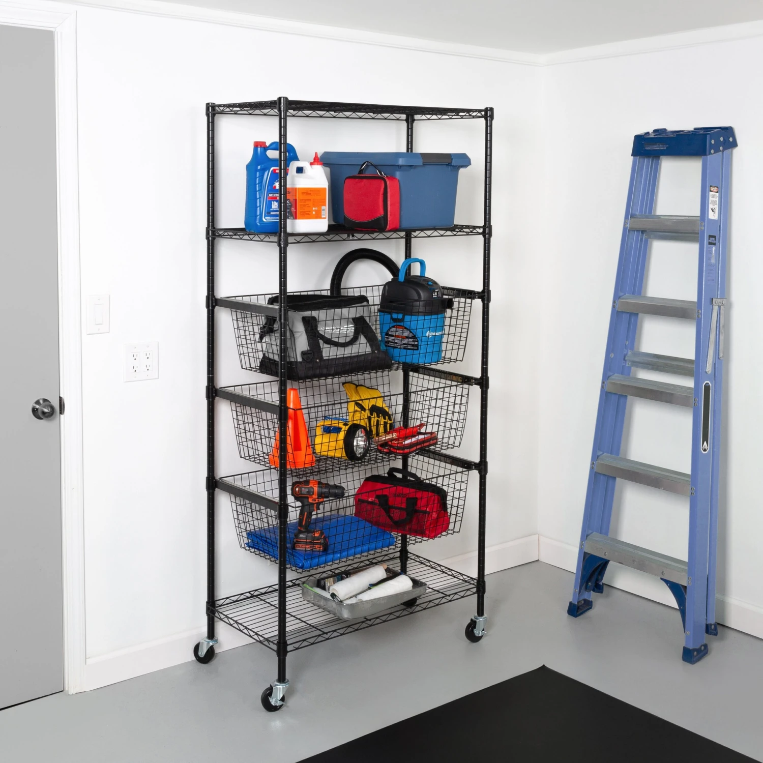 - Garage organization at its best with three shelves and three baskets to store all your outdoor items
