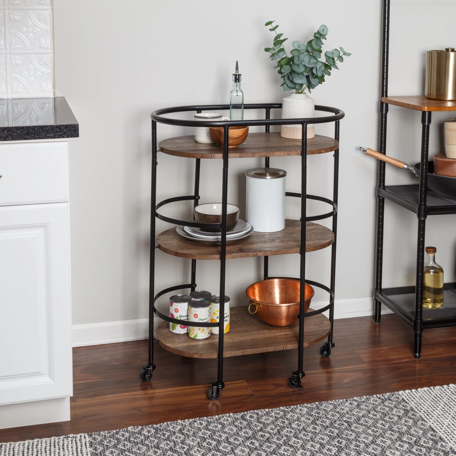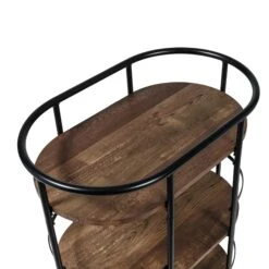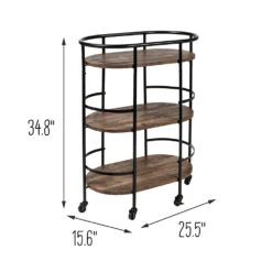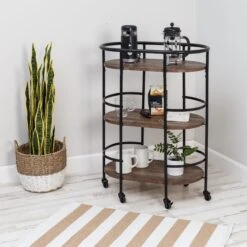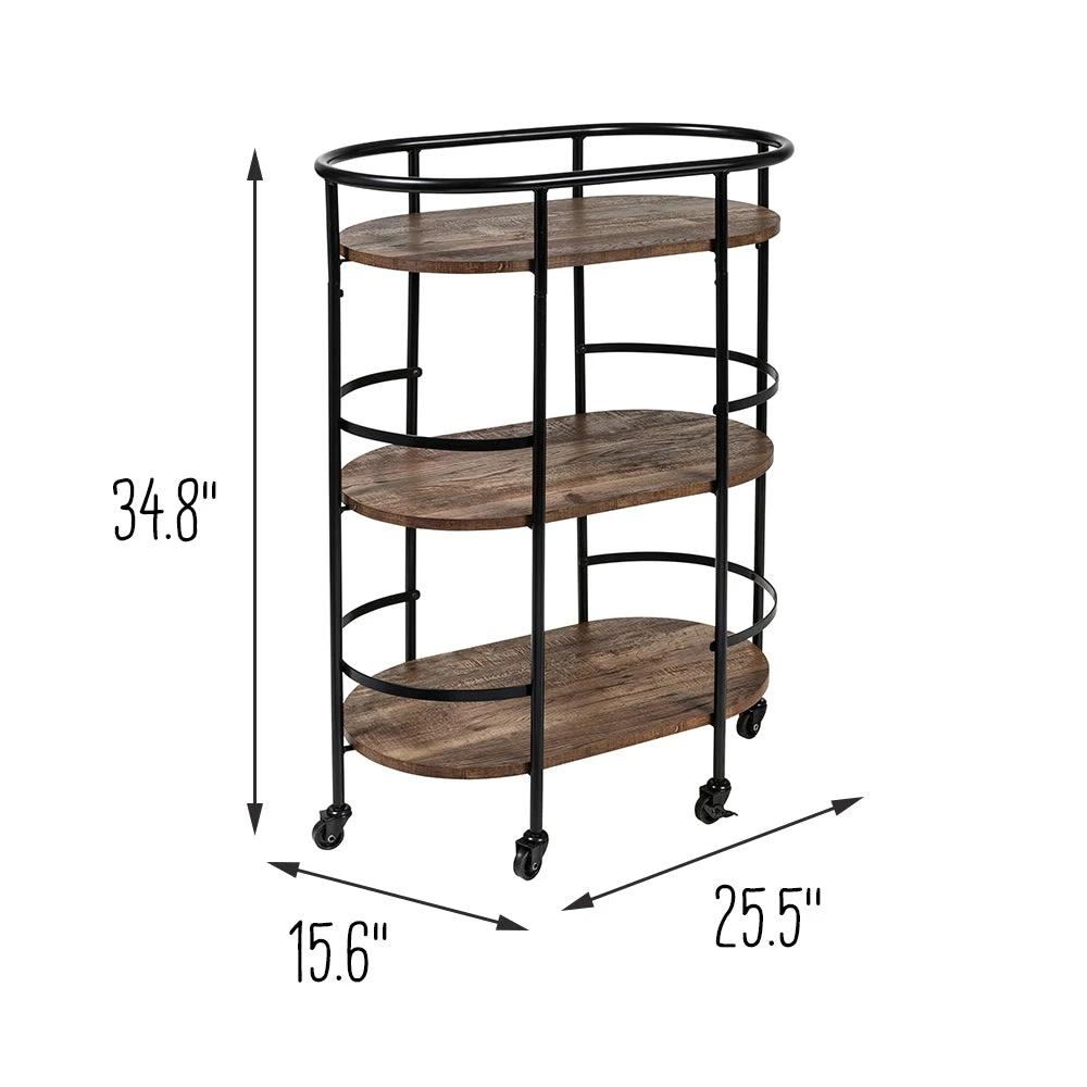 This 3-tier black and rustic brown bar cart is the life of any party as it stylishly makes its way from room to room, and when it gets there two of its rubber casters lock to hold it firmly in place. Three roomy shelves can handle anything from spirits and shakers to glasses and bottles, with the occasional snack thrown in for good measure. Its sturdy frame includes rails on all three shelves to keep everything securely in place. And as Saturday night blurs into Sunday morning, it doubles as a coffee cart or an everyday kitchen cart in the busiest room in your home.Â