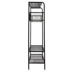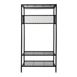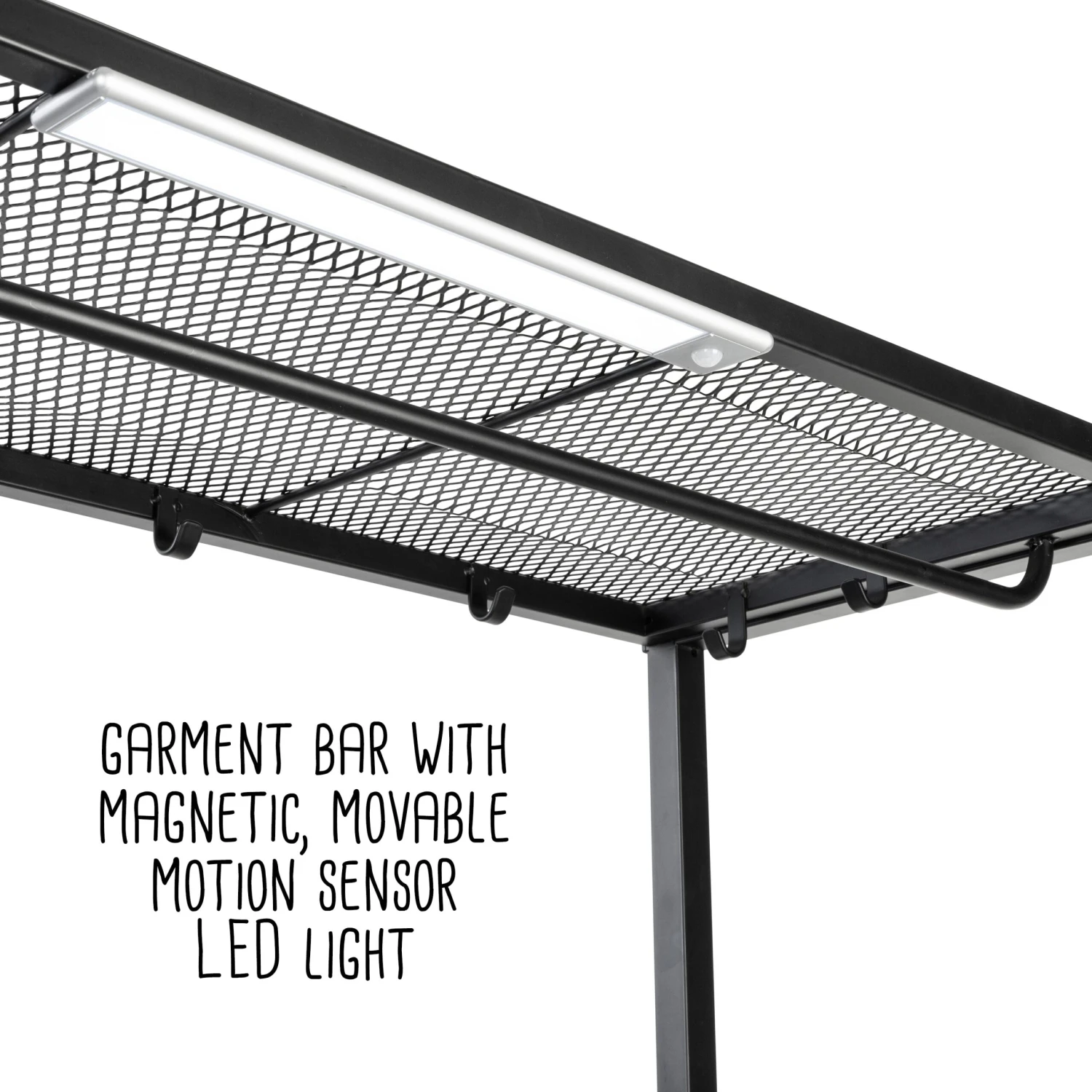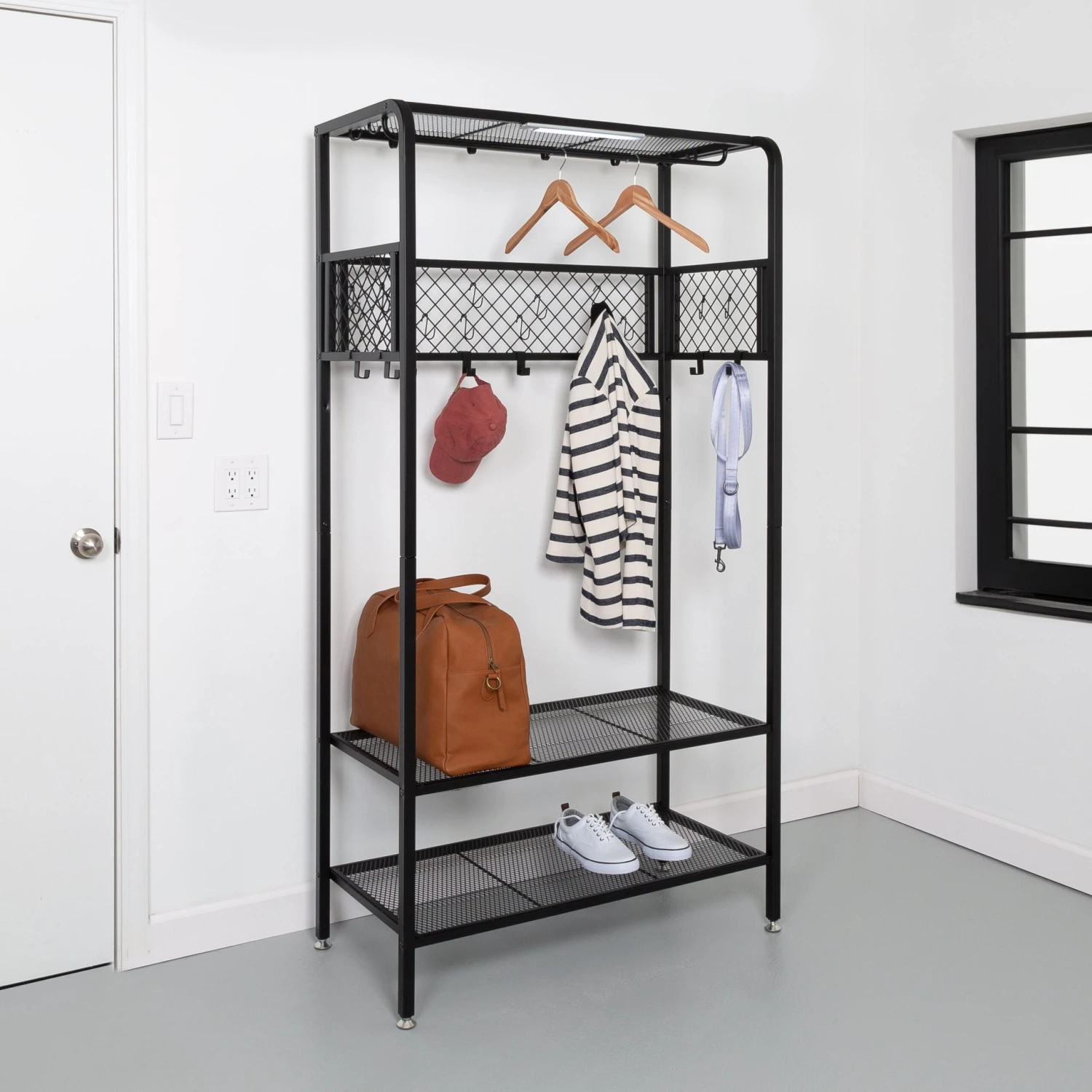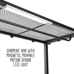 Need a central hub for all your storage and organization needs as you enter and exit your garage? Look no further than our innovative garage entryway shelving unit with a movable light as well as a clothes-hanging bar and hooks. This multifunctional storage solution is designed to keep your garage organized while providing convenient hooks for hanging bike helmets, work accessories, and more. Boots and shoes sit at-the-ready for when you’re on the go and you can ensure a well-lit and clutter-free entryway with a magnetic LED light that you can move around the unit. Say goodbye to chaos and welcome a well-organized and well-lit garage entryway.