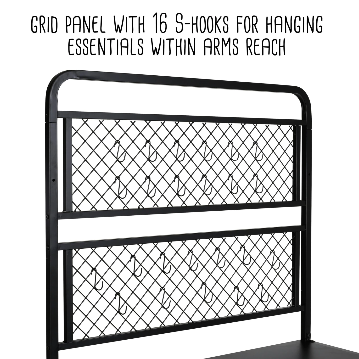 - Grid panel with 16 S-hooks for hanging essentials within arms reach