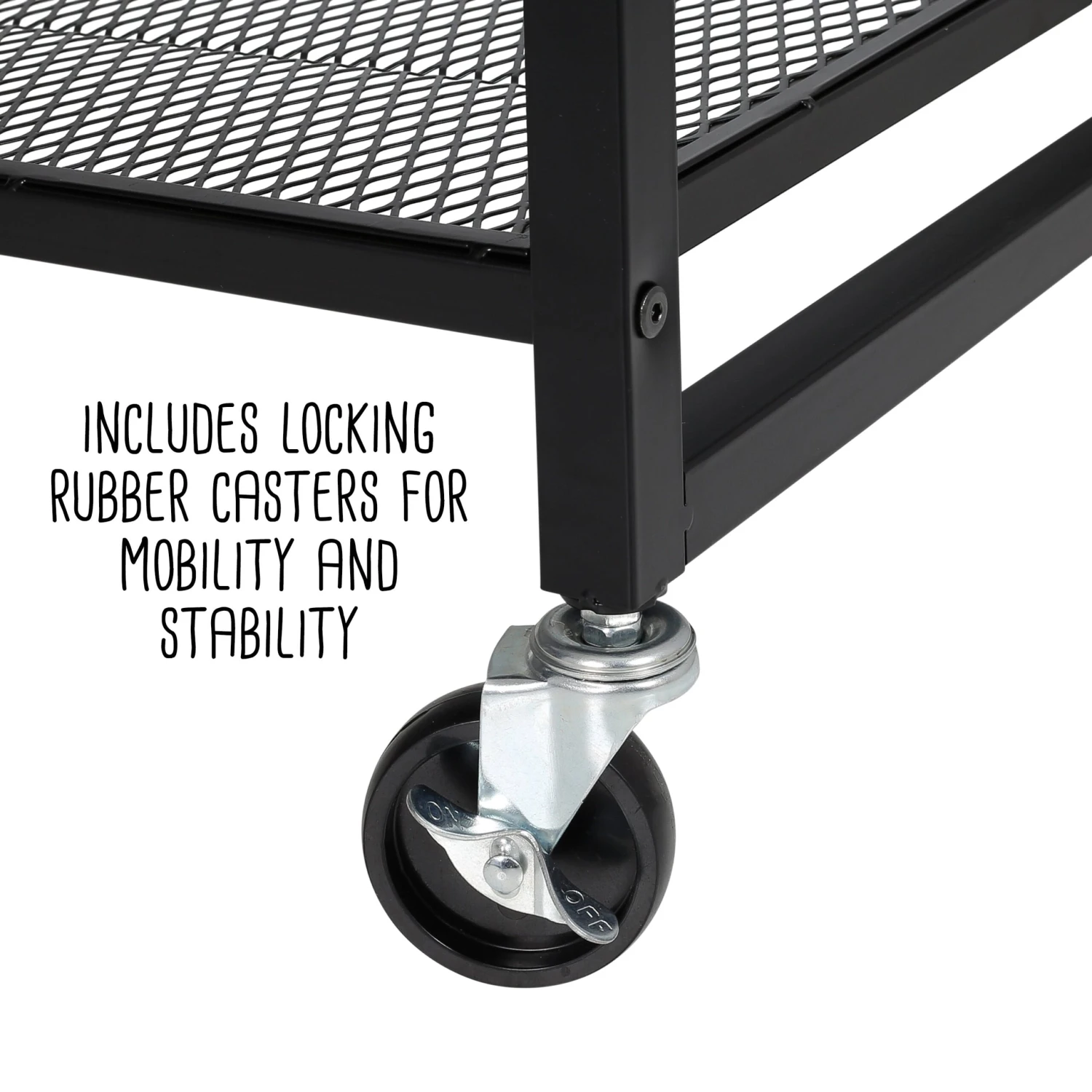 - Includes locking rubber casters for mobility and stability, assembly hardware