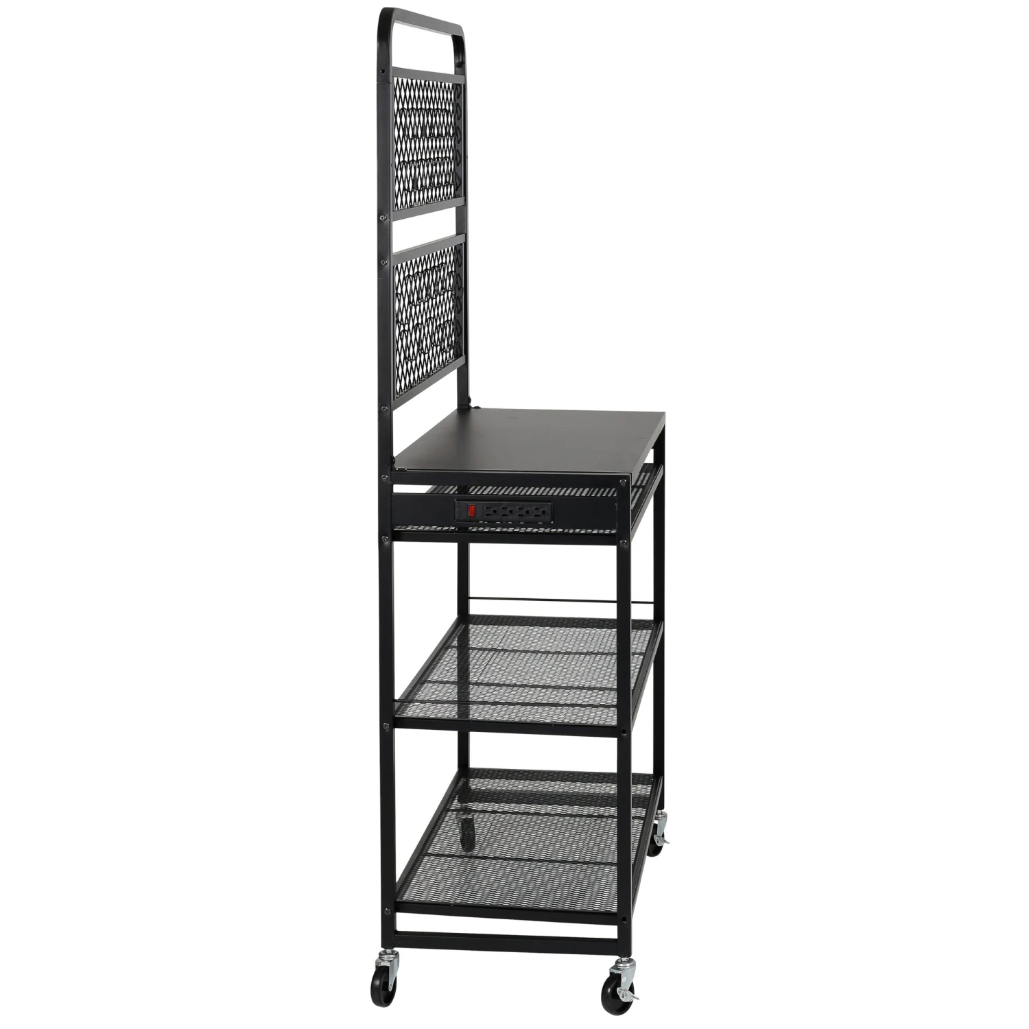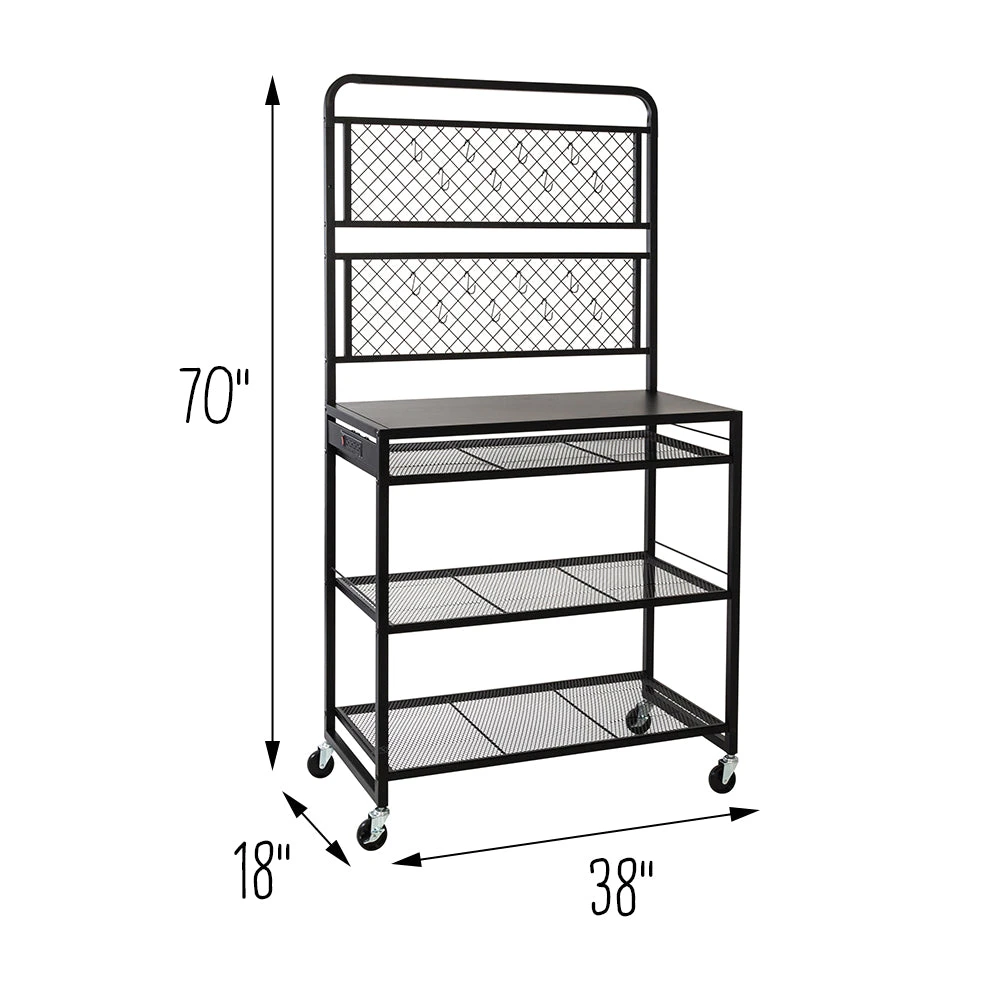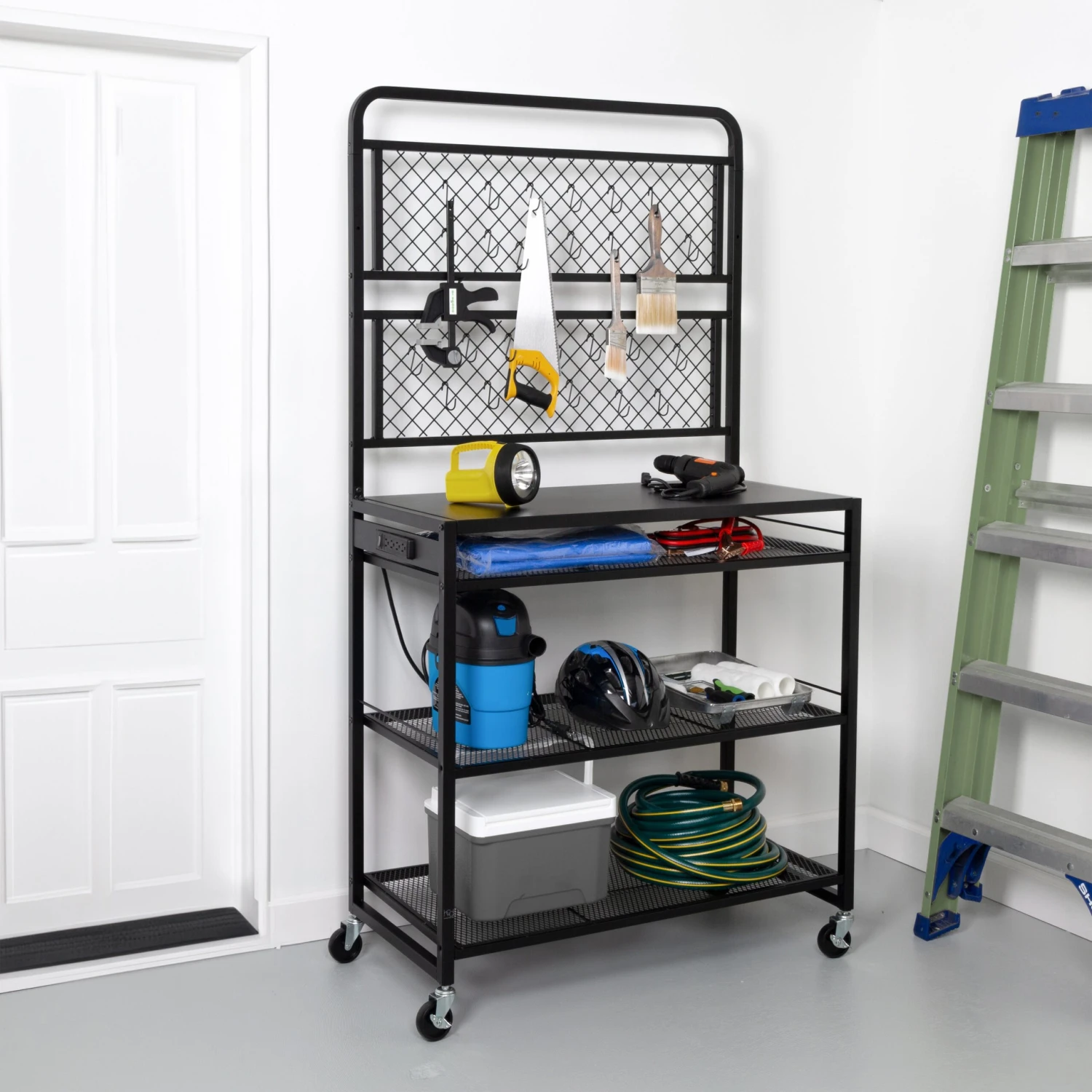 Transform your garage into a space of efficiency and productivity with this heavy-duty, all black garage workstation that packs an extra boost with its access to power outlet and hanging hooks. This premium workstation is the key to unlocking your full potential. From woodworking to car repairs 1and everything in between, this workstation empowers you to take on any project with confidence and precision. Say hello to the ultimate hub for organization in your garage!