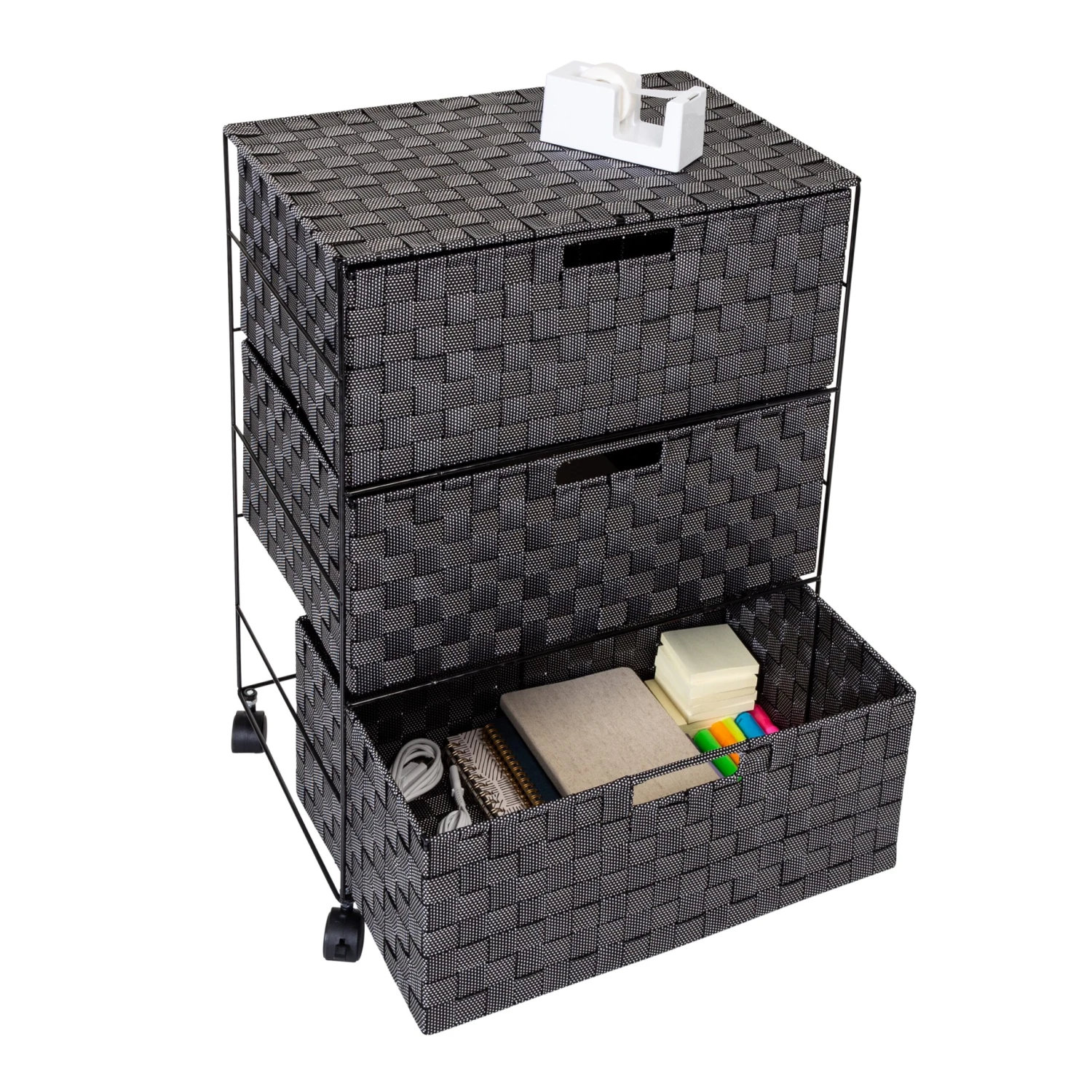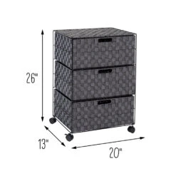 Getting organized has never looked better with this impressive double woven chest. This storage unit has three spacious drawers with handles to hold clothes, tools, office supplies or anything else that needs tucked away. Smooth rolling casters make moving the chest a breeze, and a soft top surface provides even more storage space.Â