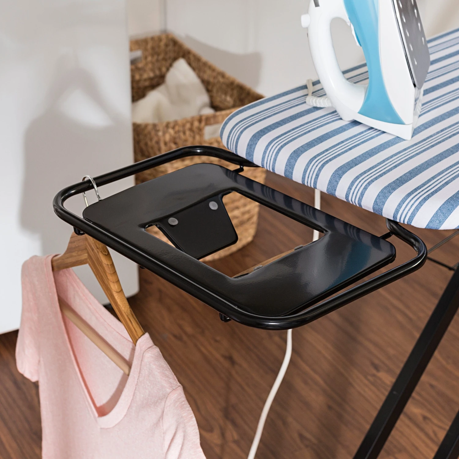 - Stand up ironing board adjusts to heights between 26” and 36”