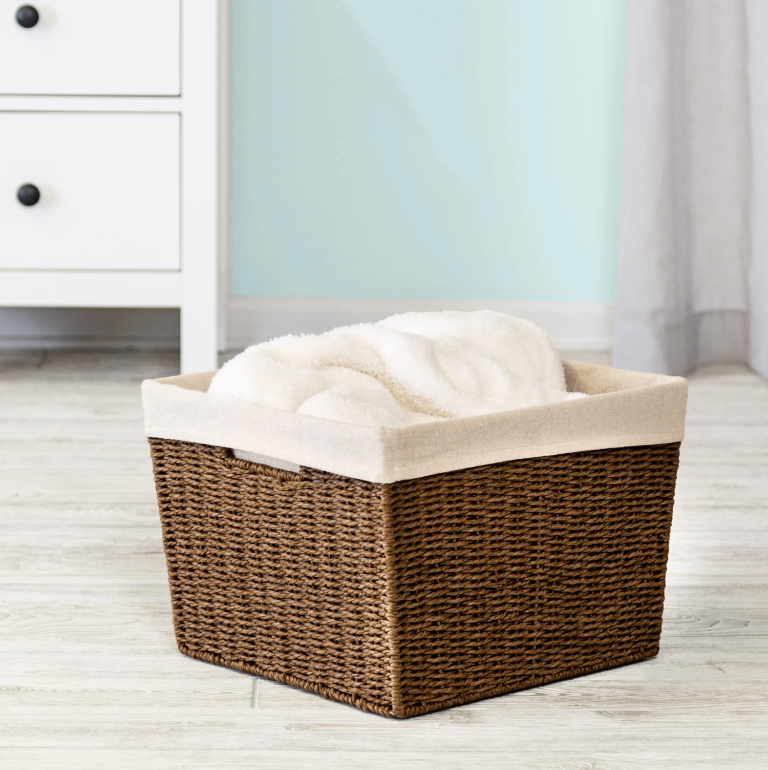 Get clutter in order with this storage basket with liner. Ideal from the kitchen to the bathroom to your home office, this storage bin works in any room in your home and its easy-grip handles help you get it there. You can feel good carrying it with its recycled and re-purposed parchment, and the tan liner adds an earthy tone to your aesthetic.