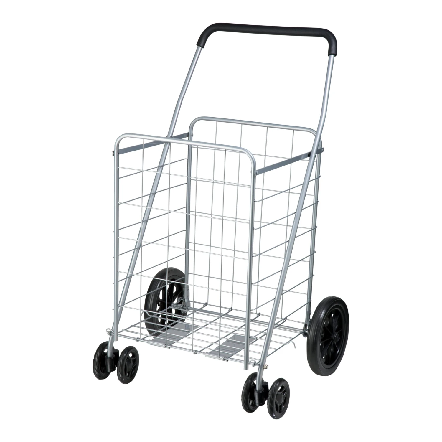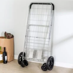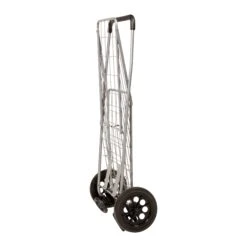 You don’t have to break your back or the bank with this all-purpose foldable cart. Perfect for toting groceries, laundry, cleaning supplies, or picnic gear, this cart is sizeable enough to hold all your belongings and functional enough to easily navigate curbs and steps. Front wheels rotate a full 360 degrees making for a tight turning radius. This all-purpose cart has a sturdy steel frame with rubber comfort grip handle to carry a maximum 50-pound load with ease. When not in use, it folds flat in seconds and tucks away neatly.