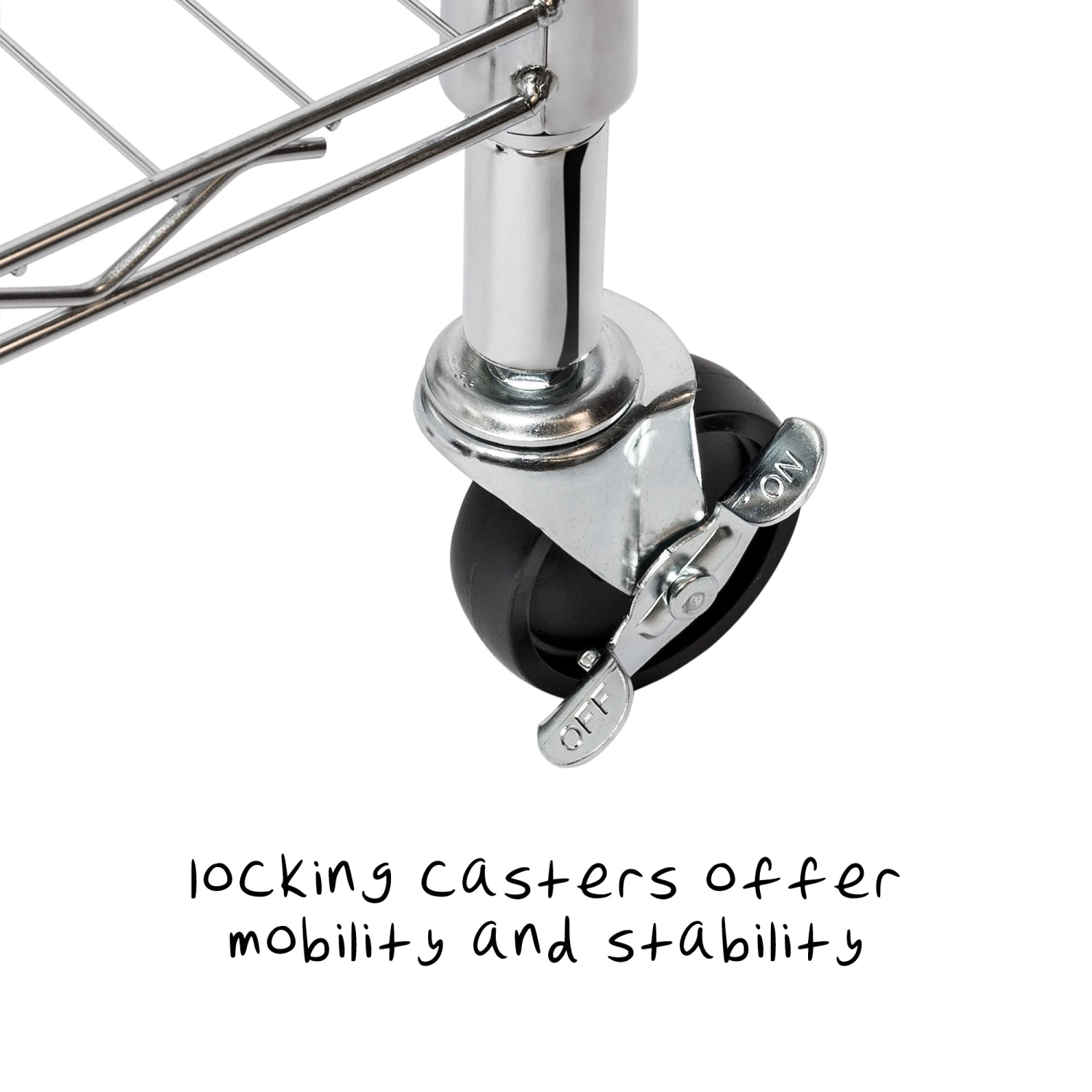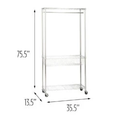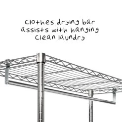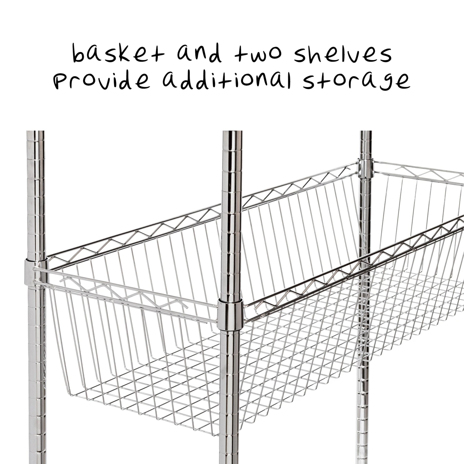 Turn your laundry room into an organized machine with this all-in-one laundry station. Two wire shelves and one wire basket give you all the room you need for clothes, detergent and other laundry essentials while the 36” bar adds much-needed hanging space. Contemporary chrome finish and sturdy steel are the perfect blend of style and functionality. And smooth rolling casters make moving it around the room a breeze.