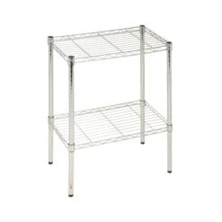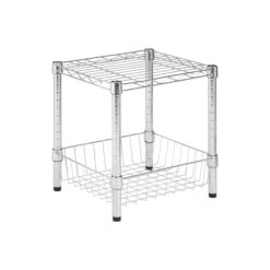 Create visible, accessible storage space instantly with this versatile shelf. Brilliant chrome finish and contemporary design makes this unit the perfect blend of good looks and functionality. Its sturdy, commercial quality frame has a grid-style thick wire top and handy lower storage basket that gets you organized. Store books, cds, towels, or anything you’d like to keep accessible. It is simple to assemble and knocks down to store or move easily. Stackable by design, this modular unit can be combined with other pieces in the line for a customized storage solution.