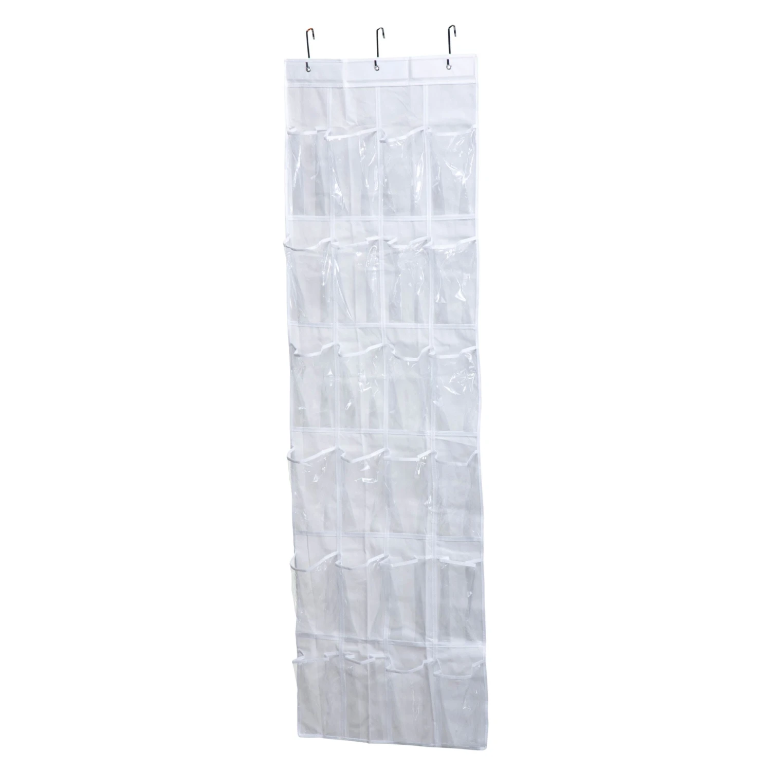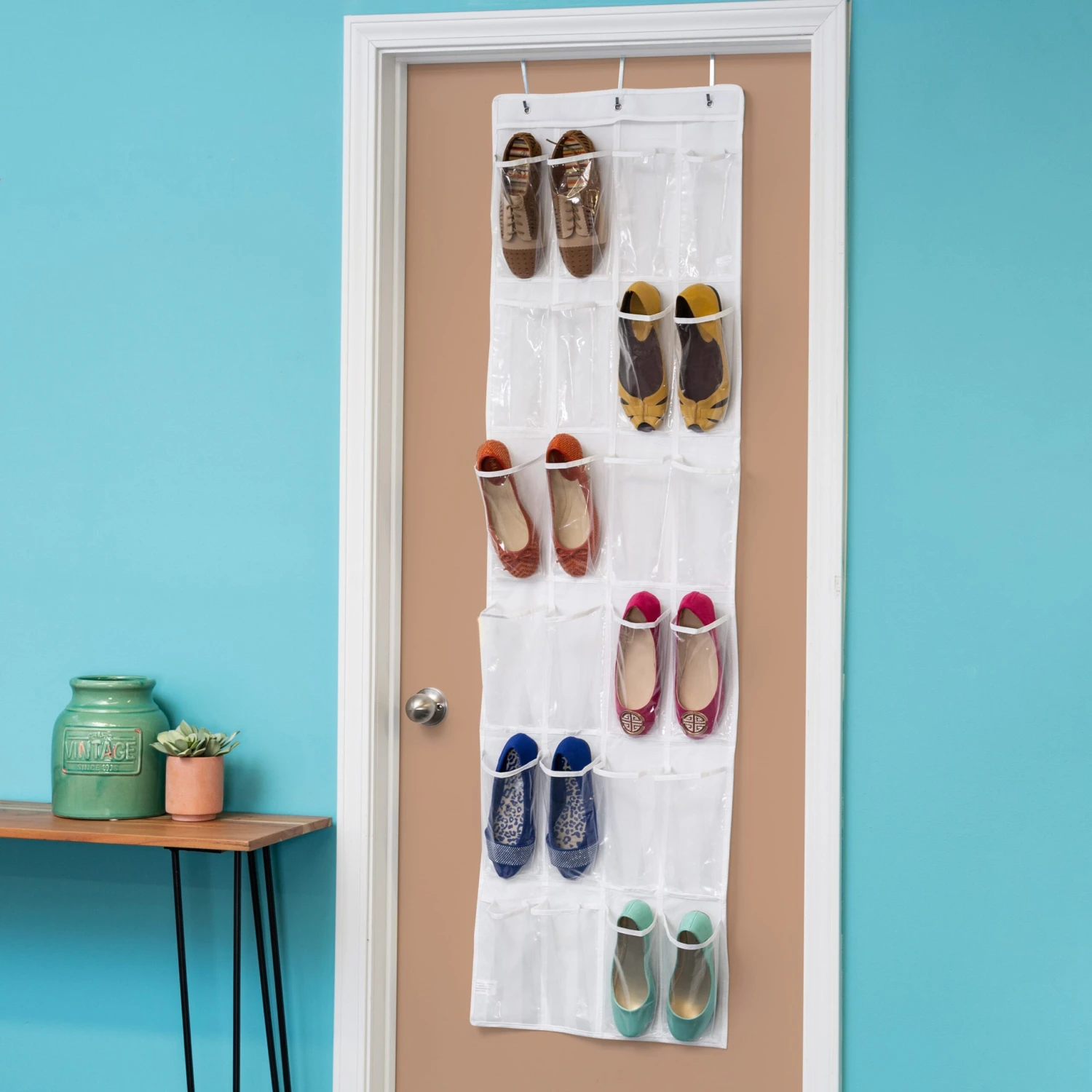 Turn a jumbled mess into a well-kept closet with this 24-Pocket shoe and accessory organizer. Easily hangs over any traditional closet door to keep 12-pair of shoes organized, off the floor, and out of sight. Complete with hanging hooks, this versatile organizer can also be used to store jewelry, scarves, gloves, craft supplies, small toys, or handheld electronics. Quickly find what you’re looking for through the clear vinyl pouches. It’s a perfect blend of economy and strength.