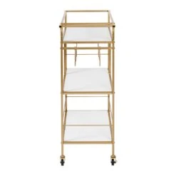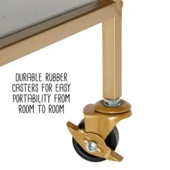 This 3-tier gold bar cart is the life of any party as it makes its way elegantly from room to room with its easy-push handle and rubber casters; two of which lock for stability once it finds its spot. The roomy shelves can handle anything from ice bins and shakers to glasses and bottles, with the occasional snack thrown in for good measure. And three slots for your favorite cabernet or sauvignon blanc makes entertaining easy. Its sturdy frame has rails on the top and bottom shelves to keep everything in place, and when the party winds down, it becomes an everyday companion as a kitchen cart in the busiest room in your home.Â