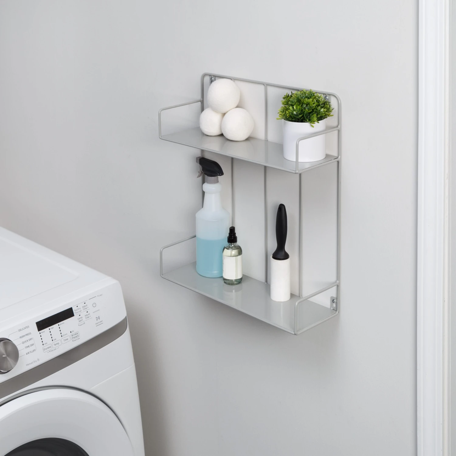 Beauty meets function with this double-tier wall shelf that features sensational curves, a sleek gray finish, and an abundance of display space. Designed to be both a wall-mountable shelf or an over-the-door shelf, the options on where you put this gray stunner are endless. The sturdy all-metal build with two shelves is perfect for organizing the laundry room, boosting bathroom storage, or adding display space to any room. Plus, it looks utterly fabulous while doing it! The soft curves juxtaposed by sleek lines combine for a design that is as wow-worthy as it is versatile. The curved side bars are a particularly wonderful feature that ensures items like books and beauty products don’t tip off the edge. Easy to hang and made to last, this is the black shelf that your décor has been craving!