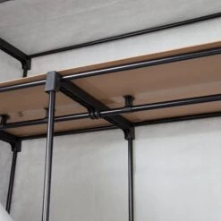 - Clothes rack plus an overhead shelf for sweaters, shirts, and other folded items
