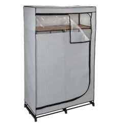 This portable wardrobe closet saves you from making some hard decisions. Because if a closet hits capacity, or a coat rack starts to teeter from a burden of bulky outerwear, purging is not the only option. Instead, house those extra garments inside this wardrobe, outfitted with both a clothes rack and an overhead shelf. A heavyweight non-woven poly cover shields contents from dust if stored in a basement. Or if it’s handier to keep this freestanding closet in a master or spare bedroom, the cover also does a nice job to cover up visual clutter, toning down the presence of an otherwise generously sized portable wardrobe. When it’s time for winter parkas, gala gowns, or whatever else finds its way inside, a clear-view panel and a swooping zipper track makes grabbing the garb a breeze.