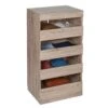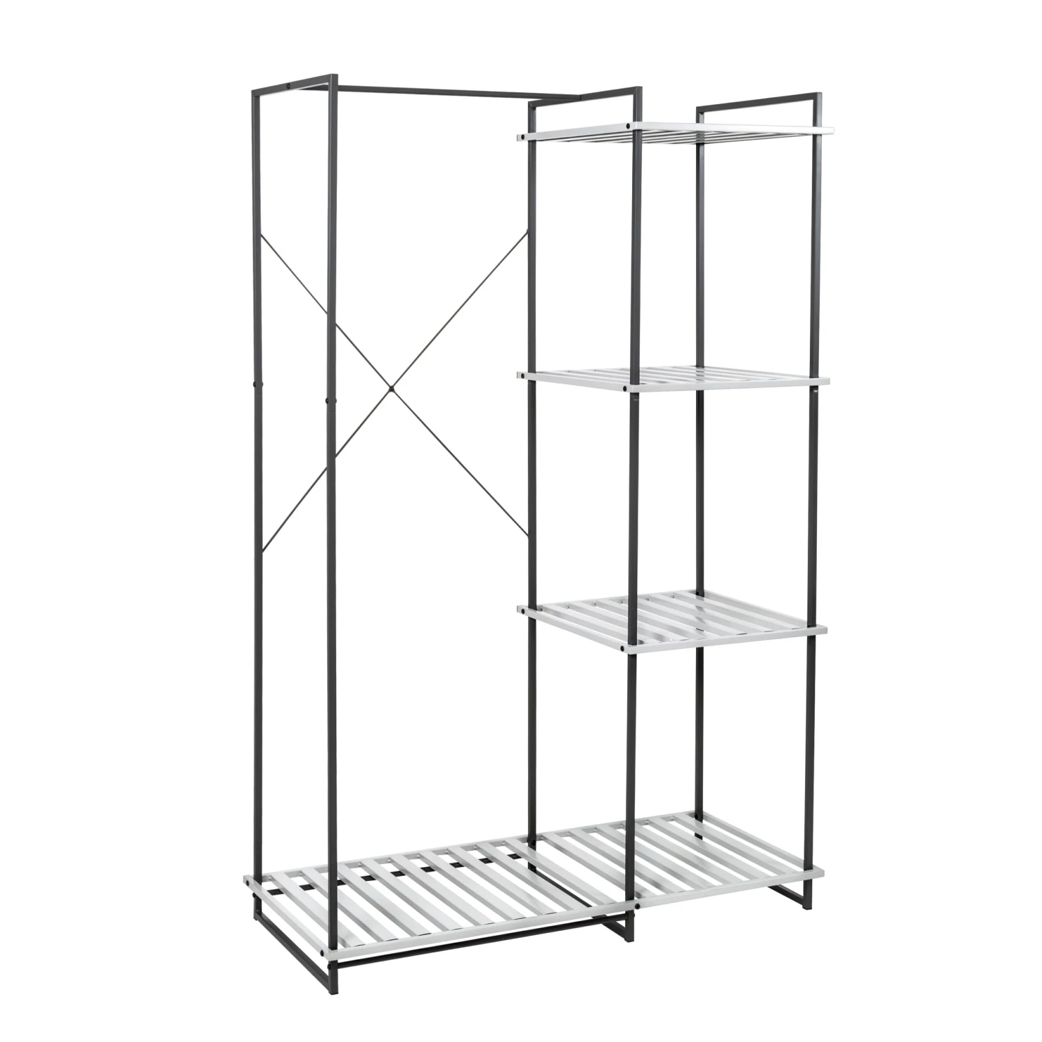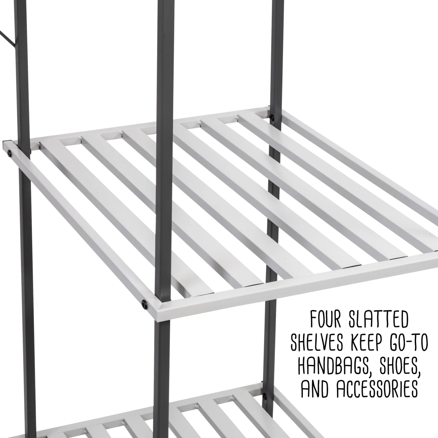 - Four slatted shelves keep go-to handbags, shoes, and accessories at hand