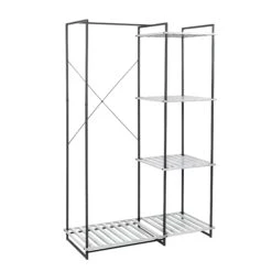 This freestanding wardrobe is a welcome sight in spaces big and small. In a spacious master bedroom, use it as a modern valet, as a place to mix and match outfit options. In a studio apartment or other spots where real estate is precious, think of it as an open closet that can give home to the shoes, shirts, and slacks that need one. Or think outside the bedroom box. This freestanding wardrobe could also be handy in a hallway or a mudroom, where boots, umbrellas, rain coats, carryalls, and more are ready to grab and go. With a sturdy steel frame that can handle up to 85 pounds, it’s up for the job, wherever it may be.