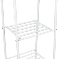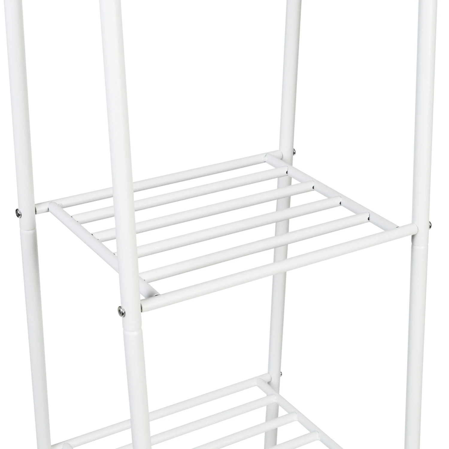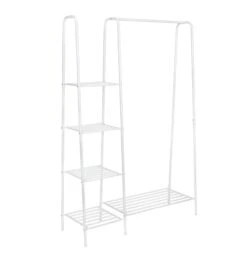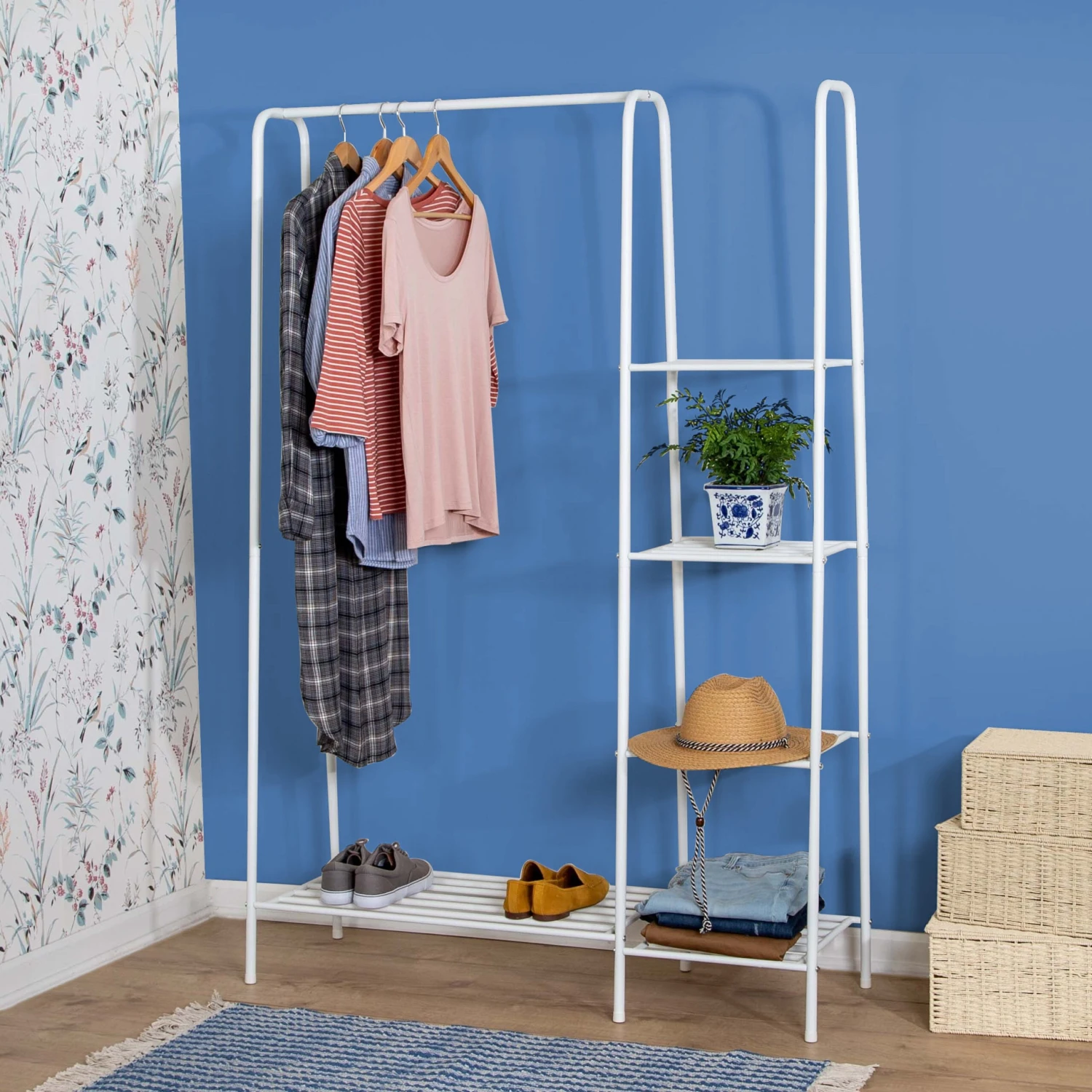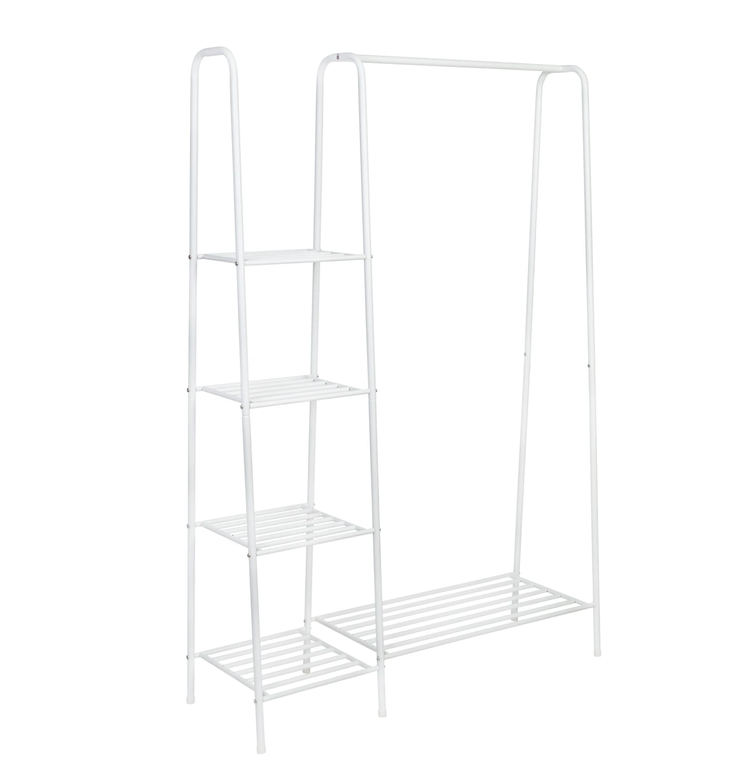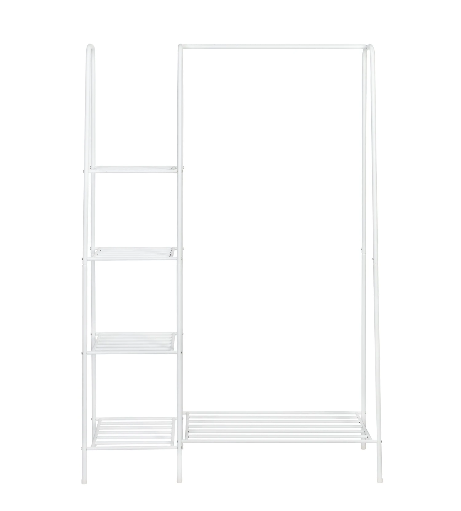 Some freestanding open wardrobe closets are strictly functional. They’re there—stuck in a bedroom corner, tossed at an end of a hallway—to catch overspill from a closet bursting at the seams. And while it’s important for these portable closets functionally to store clothes, can’t they also be a bit stylish in the process? The smooth matte white finish on the steel frame of this open wardrobe seems to think so. With rounded edges and an asymmetrical frame, this freestanding closet nods toward antique sensibilities for a look that suggests a fun countryside chic. And with four shelves and a sturdy hanging rod, this piece is sure to solve storage needs while scoring some style points.