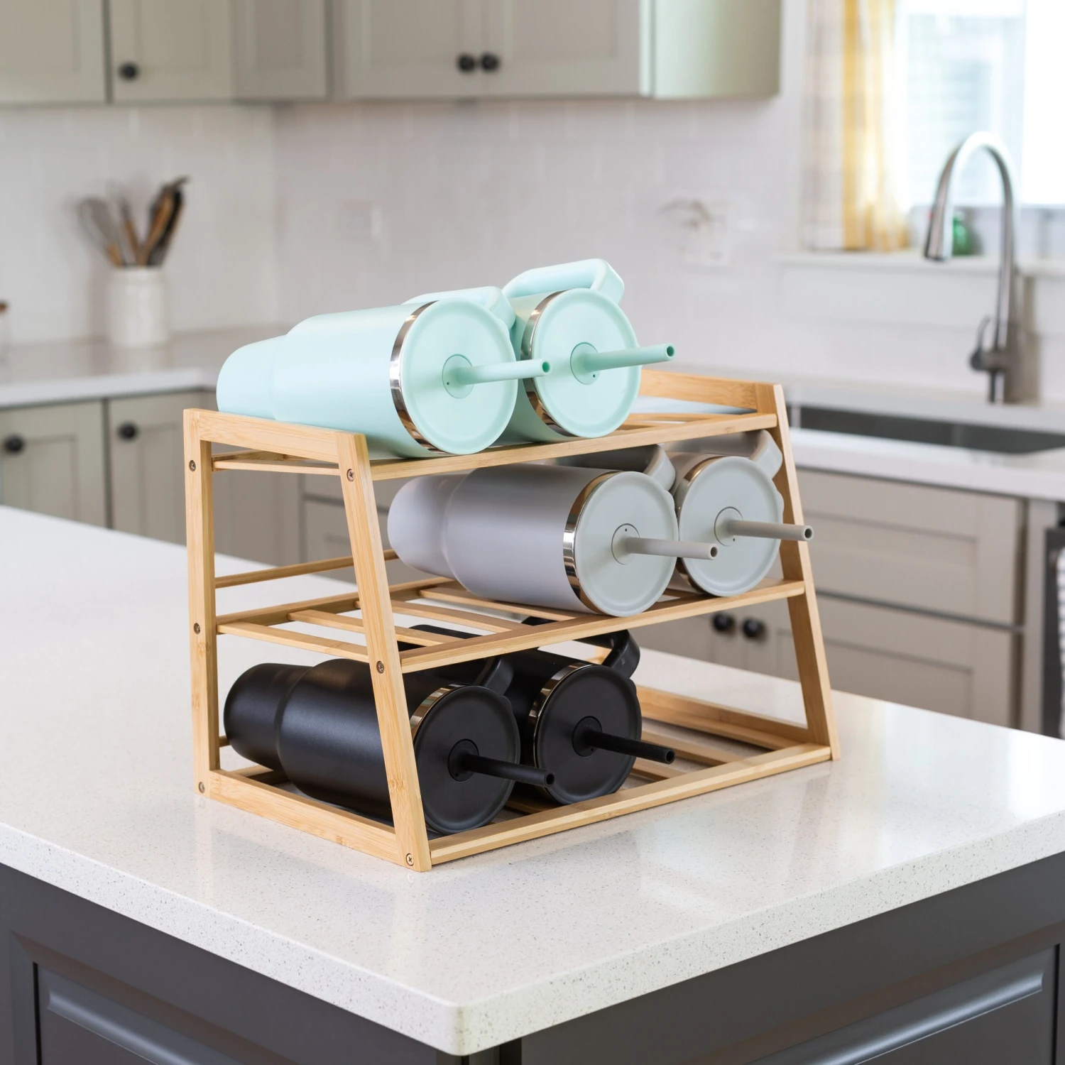 - Eliminate clutter and neatly arrange your water bottles, tumblers or to-go coffee thermos