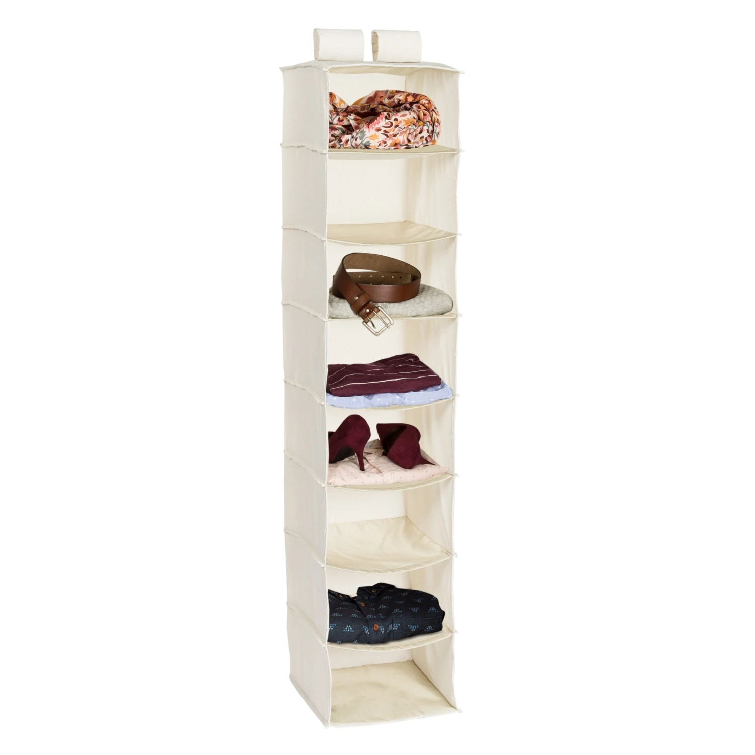 Turn a jumbled mess into a well-organized closet with our soft storage solutions. This durable piece keeps clutter at bay using every inch of available space for endless storage possibilities. This organizer has reinforced shelves for great capacity and easily attaches directly to your closet rod with Velcro-style straps. Perfect for organizing bulky sweaters, pants, shirts, and bags. One item in Honey-Can-Do’s mix and match collection of sturdy canvas closet organizers available in several colors, it’s a perfect blend of economy, strength, and style. Matching storage drawers (SFT-01255), sold separately, instantly create more space for socks, undergarments, and accessories.