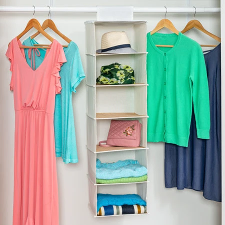 Turn a jumbled mess into a well-organized closet with our eco-friendly soft storage solutions. Made of sustainable materials, this durable piece keeps clutter at bay using every inch of available space for endless storage possibilities. This organizer has reinforced shelves for great capacity and easily attaches directly to your closet rod with a reinforced Velcro strap. Perfect for folded sweaters and other garments, it can also be used for small bags and accessories. Beautiful bamboo accenting creates a classic, eco-friendly look that complements any décor. Add Honey-Can-Do storage drawers (sold separately) for an alternate storage option.