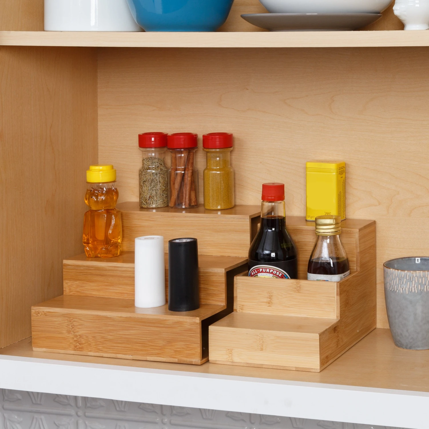Spice up your kitchen organization—and modernize it—with a sleek and adjustable bamboo spice rack. The minimal wood design features 3 tiers, a sleek natural finish, and cut out handles that make adjusting the width a cinch. Squeeze this spice rack organizer into a cabinet so you know exactly what spices, extracts, or essential oils are in the back. Or widen it to stylize your countertop and keep your favorite flavorings and small condiments in reach. Whether used as a cabinet spice rack or countertop organizer, the open compartment ensures taller items like straws, jars, and utensils don’t get left out of this chic display.