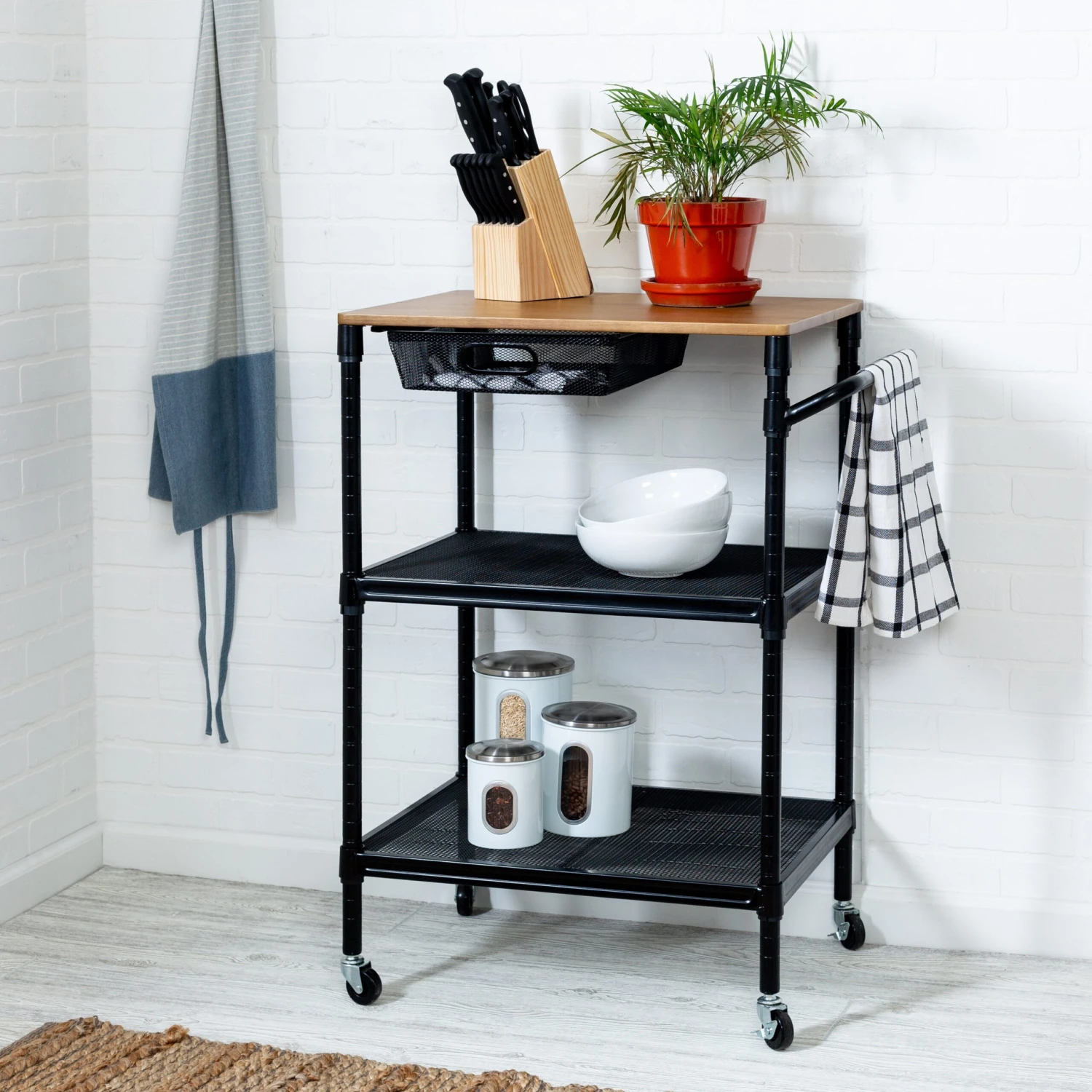 This rolling kitchen storage cart does it all. Saturday night it’s your bar cart, rolling from room to room serving guests. And when you wake up Sunday it goes back to being your cutting board when your kitchen island runs out of room. Hang towels from its adjustable bar and easily access kitchen tools from its pull-out basket. Additional storage can be found in its two bottom shelves. Go ahead, roll it around and smile.