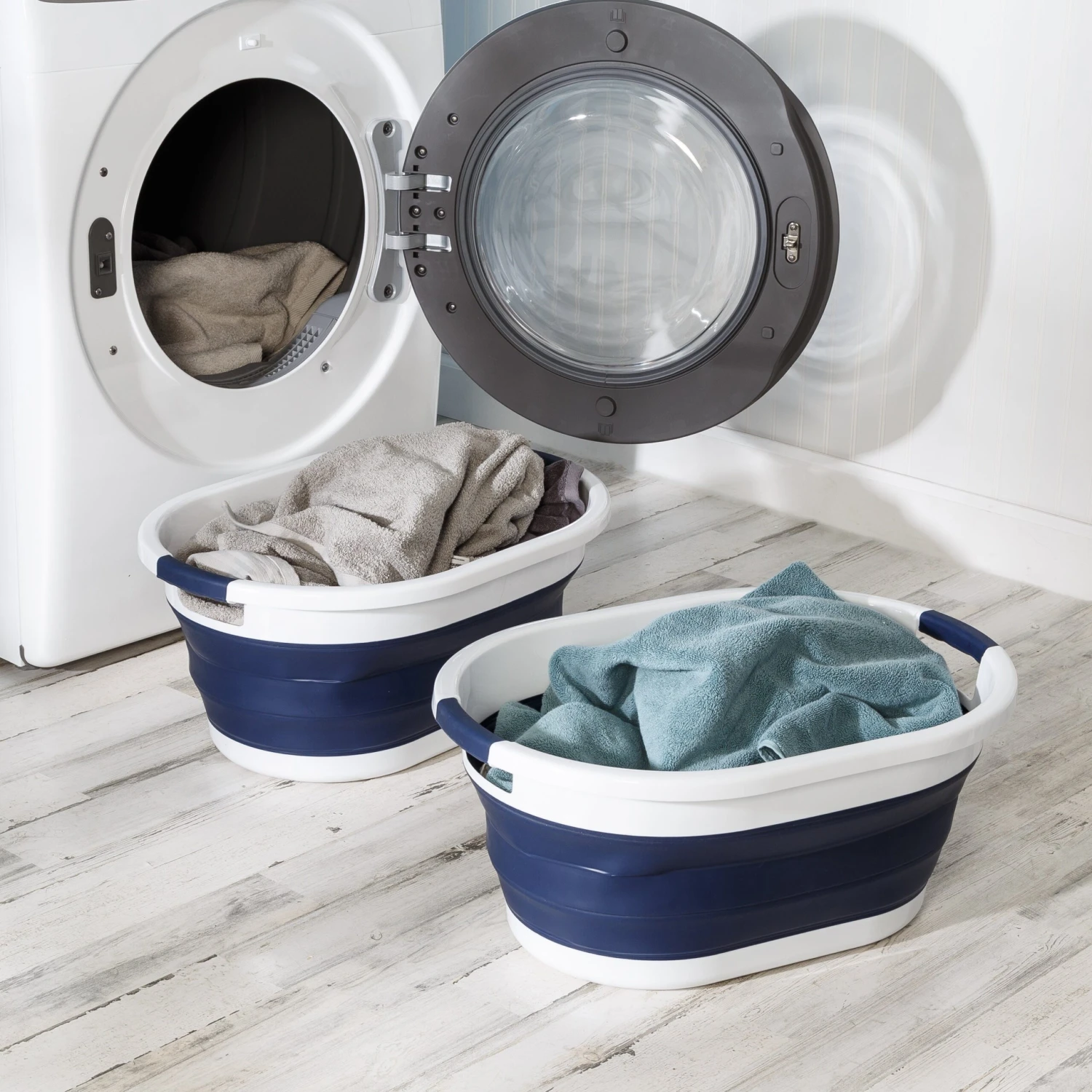 - Pop-up laundry baskets that collapse when not in use for easy storage