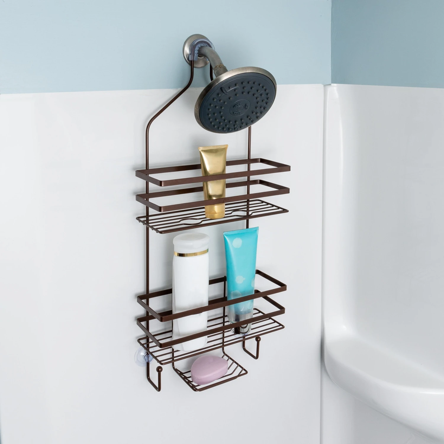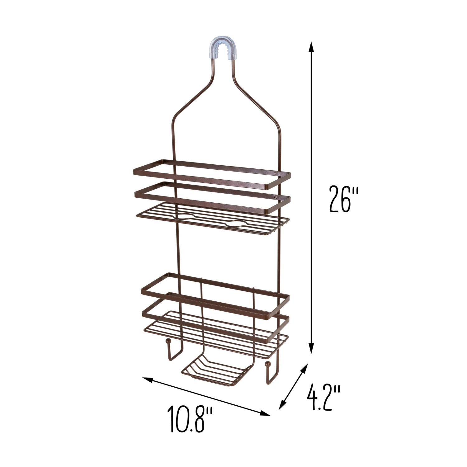 - Offers 2 tiers, 2 hooks and 1 soap tray for storage