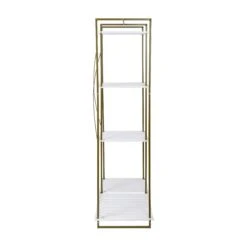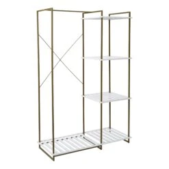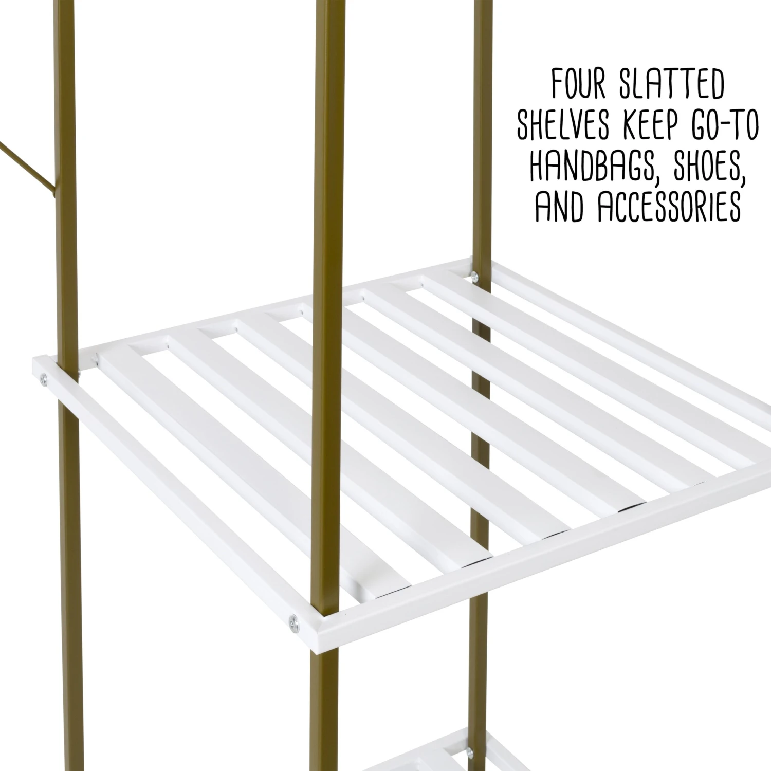- Four slatted shelves keep go-to handbags, shoes, and accessories at hand