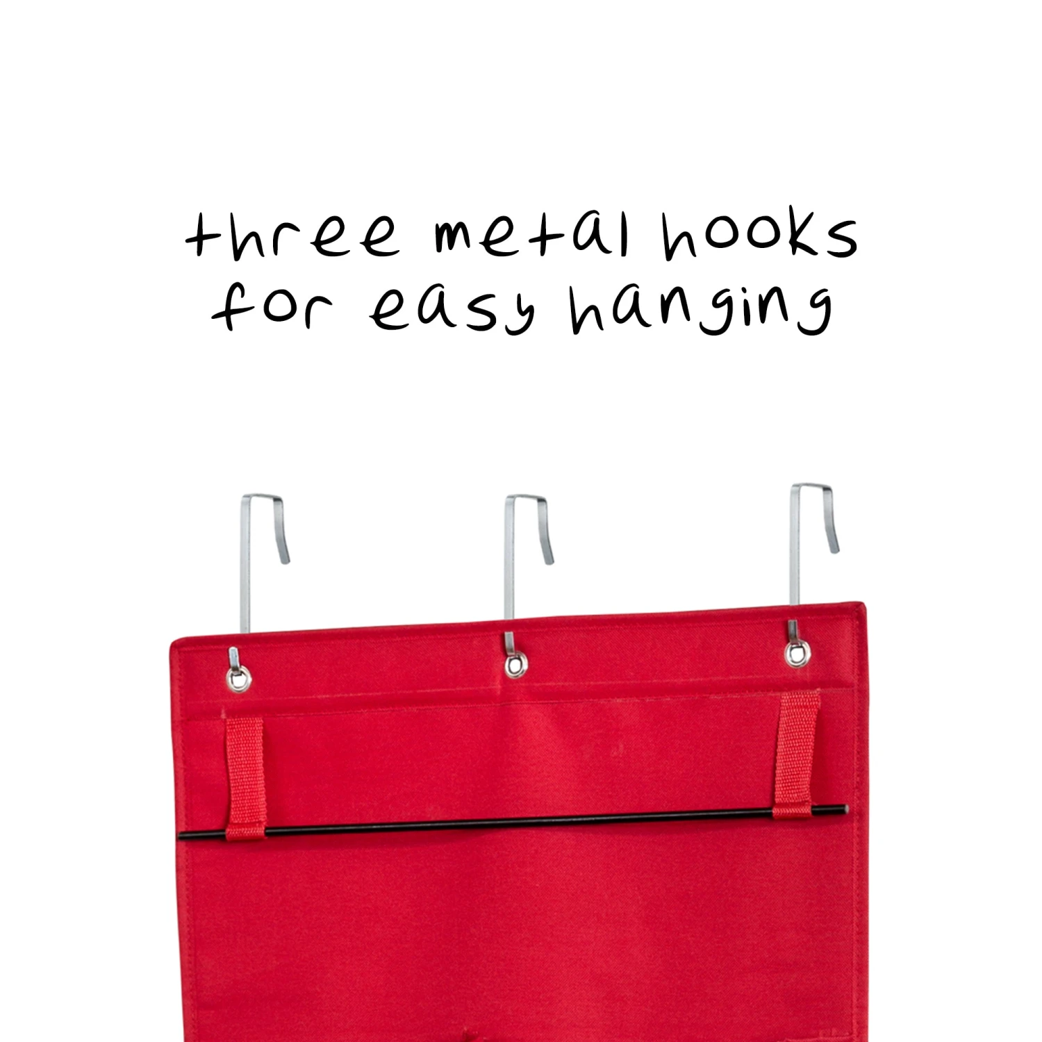 - 3 hooks hang over any standard sized door to maximize space