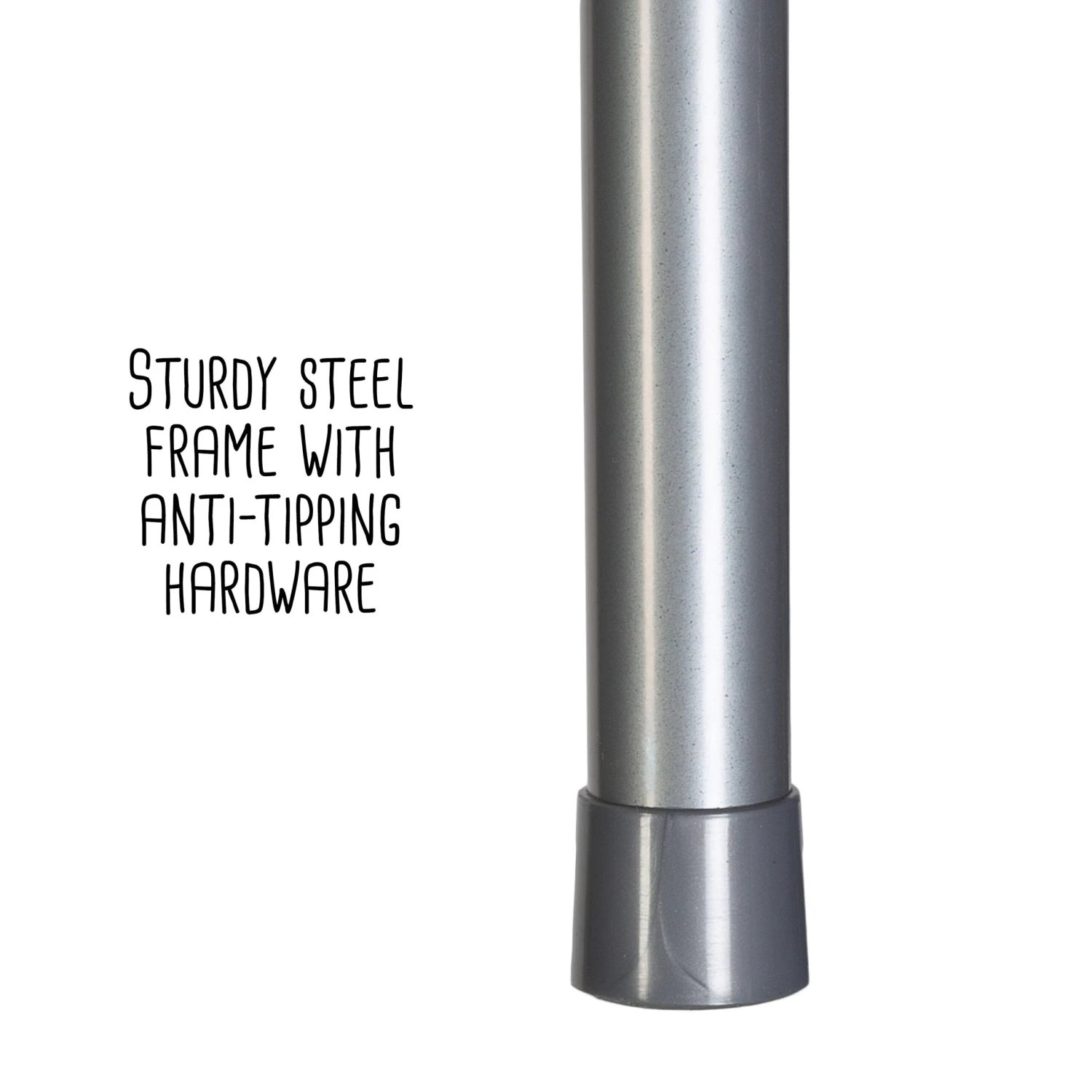 - Sturdy steel frame with adjustable bottom bar and anti-tipping hardware