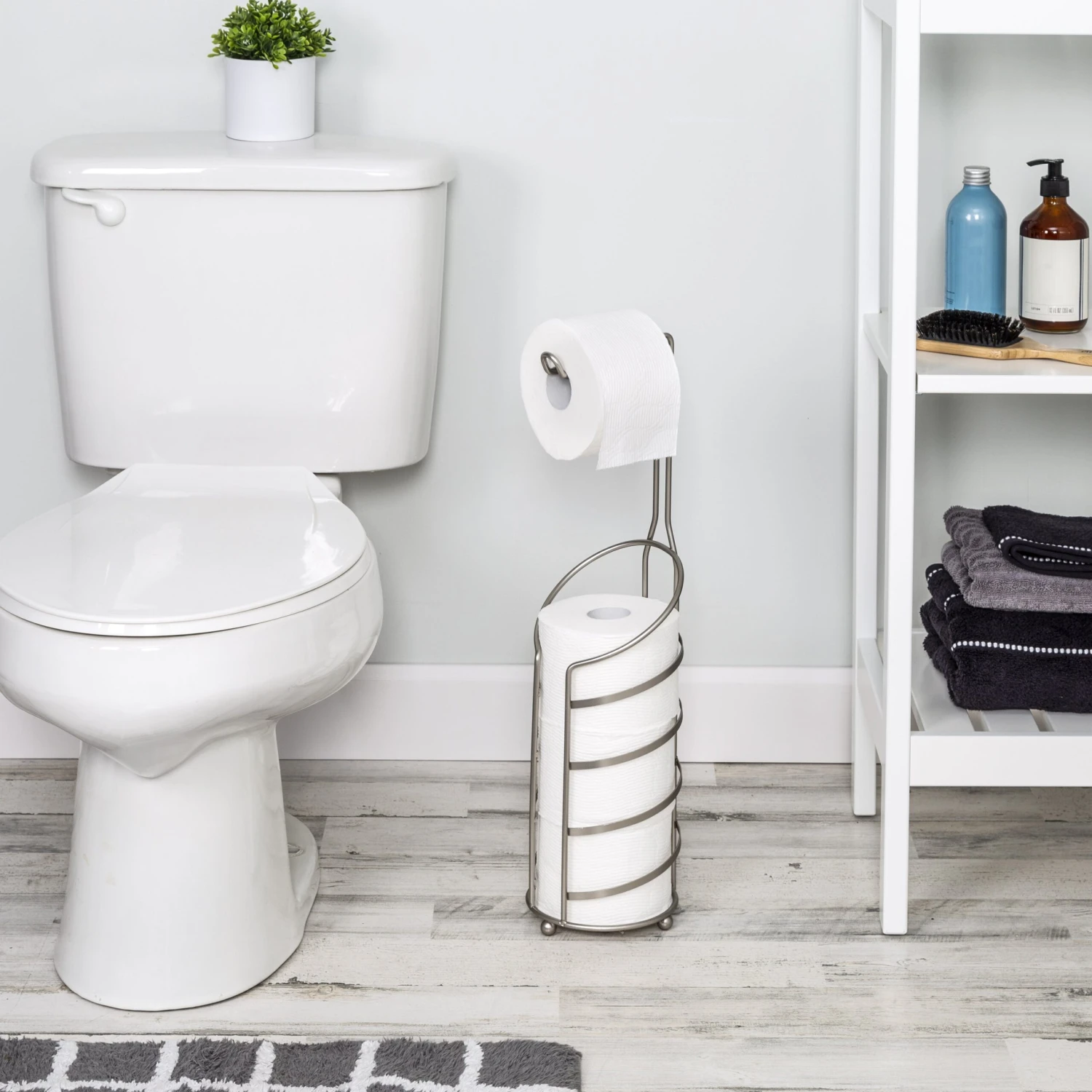 - Conveniently stores up to 3 toilet paper rolls in reserve plus one in use