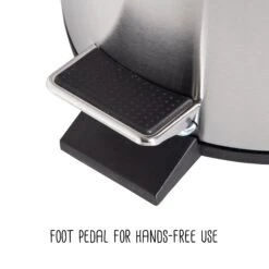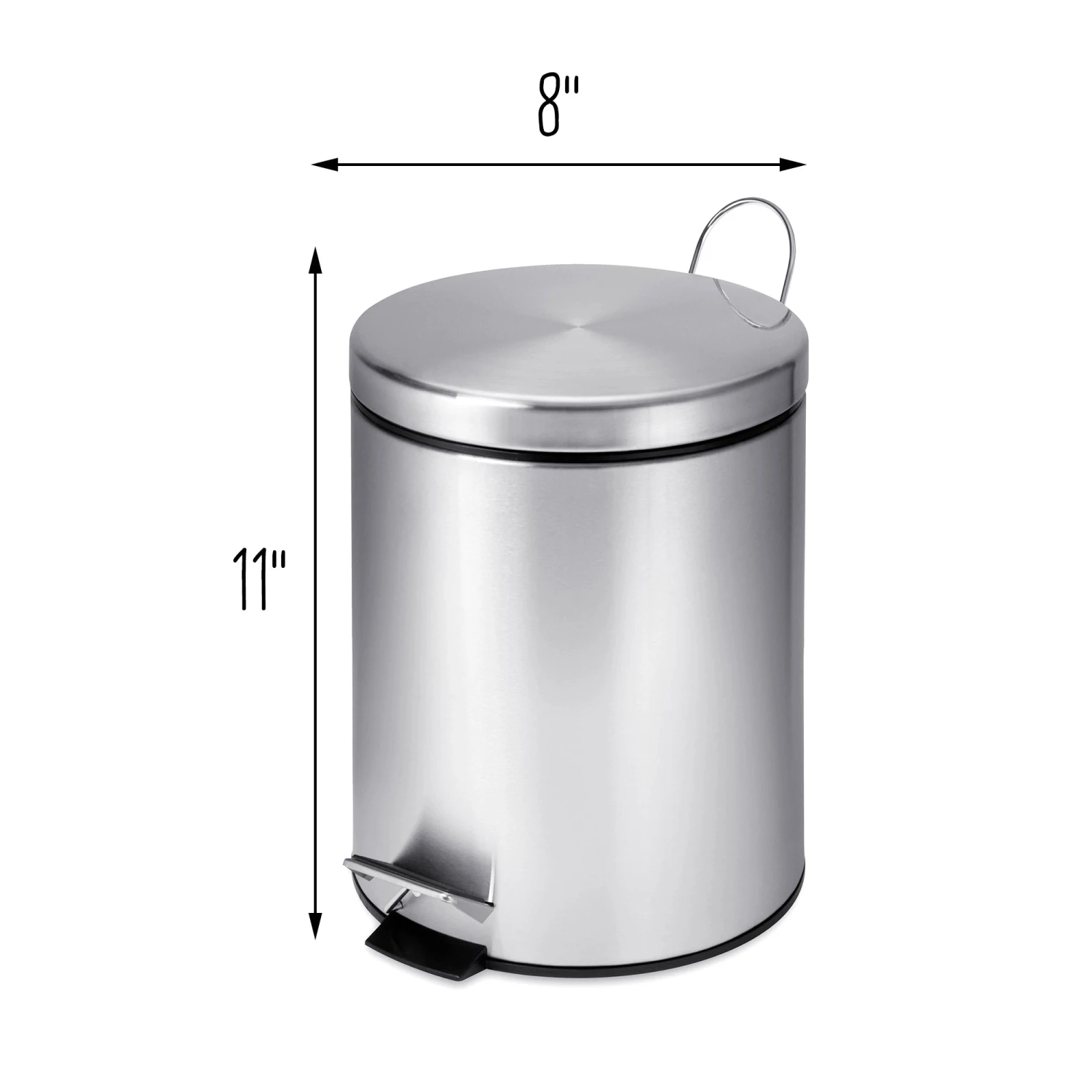 A contemporary addition to any home or office, this 5L (1.3 gallon) trash can is the perfect size for a bathroom or home office and boasts sturdy construction for daily use. A steel foot pedal provides hands-free operation to keep germs at bay. A plastic inner trash bucket is fully removable for easy emptying and cleaning. The brushed stainless, hand print resistant exterior is easy to clean and features a metal fold down carrying handle.