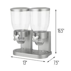 - Two plastic canisters together keep 35 ounces of cereal and snacks fresh