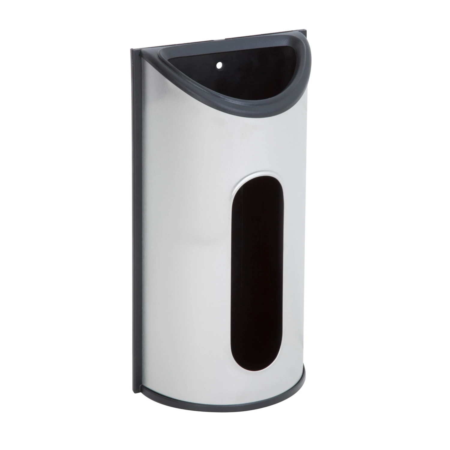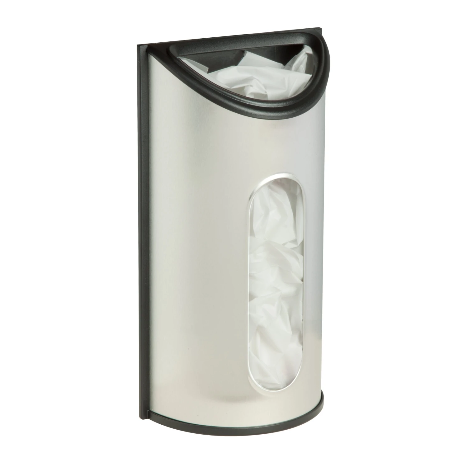 Mount this easy to use dispenser on a wall or inside a shelf for convenient, easy access. Stores 30 plastic grocery bags. Simply tuck them into the top opening, and pull them out from the wide dispensing area on the front of the holder. Durable stainless steel construction.