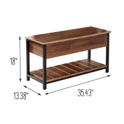 The entryway is the first impression in any home, and this sleek and yet functional shoe storage bench is not only easy on the eyes but provides needed functionality. With a slatted shoe shelf on the bottom and open-top storage, you can keep things out of site, and yet still handy when you need them while running out the door. And it holds enough weight for you to sit on the top bench while putting your shoes on or taking them off after a long day.Â