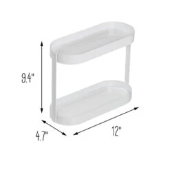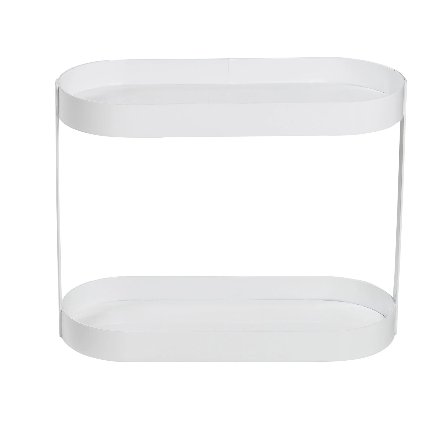 Make messy countertops a thing of the past while keeping your everyday bathroom necessities easily accessible. This counter organizer shelf features a sleek white metal build with two tiers of oval trays to keep toiletries and makeup organized and corralled. The top shelf is the perfect size to slide in a toothbrush holder, soap pump, or a handful of hair products, while the bottom tray is ideal for smaller items like lipsticks, serums, razors, and jewelry. The simple design and crisp white finish make this the perfect bath shelf for any home that craves organization and wants to reclaim its counter space.