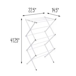 Drying clothes and linens has never been easier. This drying rack easily folds down to 3″ wide and can be stored just about anywhere. Its sturdy steel construction, and superior strength and stability allow it to hold damp clothes and linens with ease. This drying rack is eco-friendly and has over 20 feet of drying space for cost-efficient drying. No assembly required.