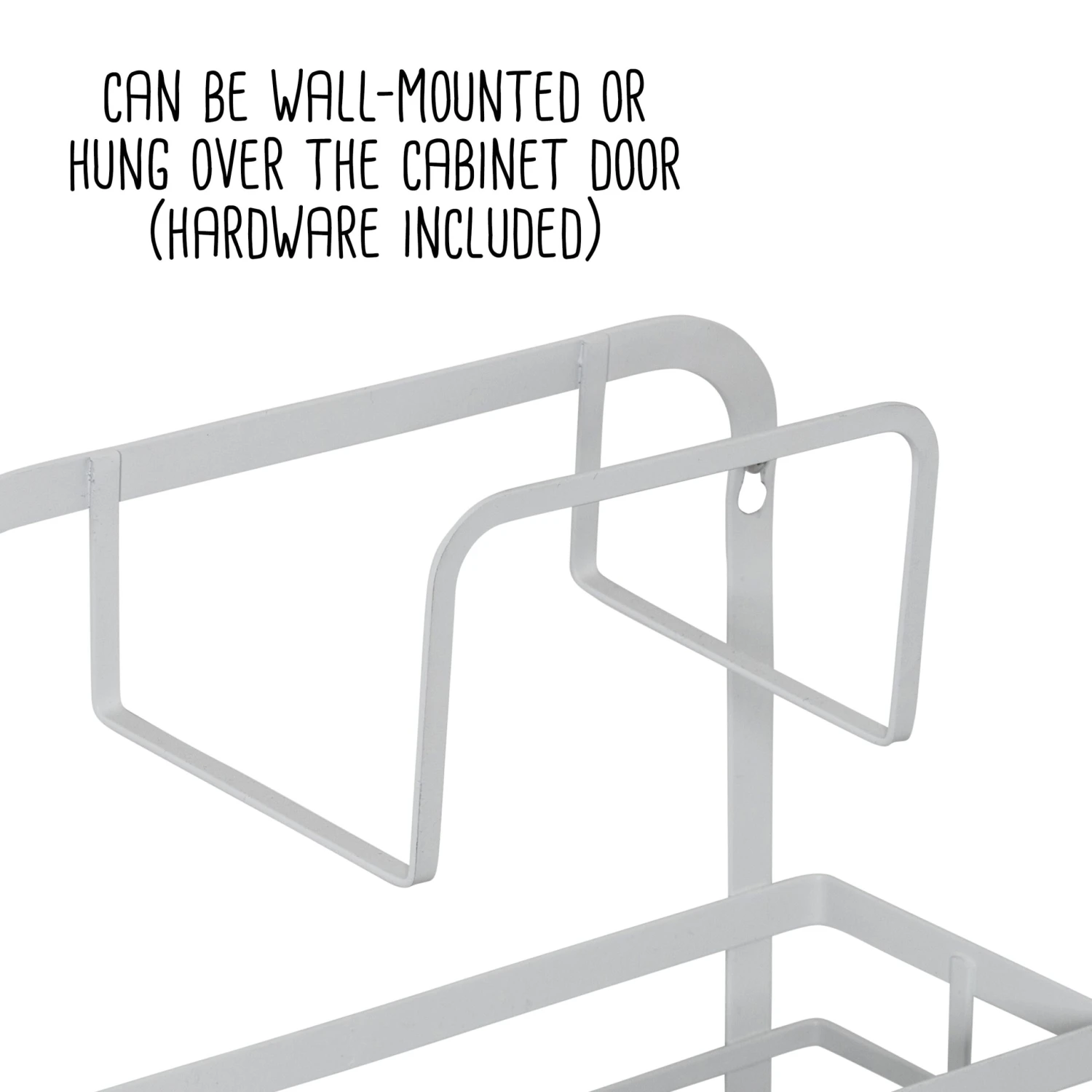- Can be wall-mounted or hung over the cabinet door (hardware included)