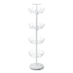 Go vertical and store up to 24 pairs of shoes on this bright white shoe tree. With only a single square foot of floor space required, you can reclaim your room and keep your shoe collection accessible and organized. All four levels revolve separately and adjust in height to accommodate small and large shoes, which gives you a flexible storage solution and easy access to every pair. The durable steel construction withstands daily use. Some assembly required.
