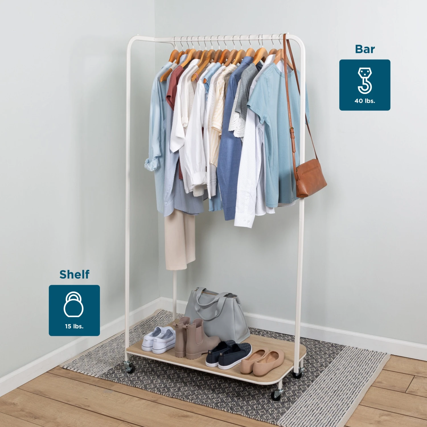 Say goodbye to closet overflow with this versatile garment rack with added space for shoe storage. With its thoughtfully designed hanging rod, our Garment Rack offers ample space to store and display your clothes, including shirts, dresses, jackets, and more. And when you’re on the go, your shoes are within arms reach stored under your clothes on the built-in shoe rack. The rounded corners, asymmetrical frame & smooth off white, matte finish over steel add up to an elevated modern look with a sophisticated antique feel. This durable and sleek garment rack is a must-have addition for any home, dorm room.